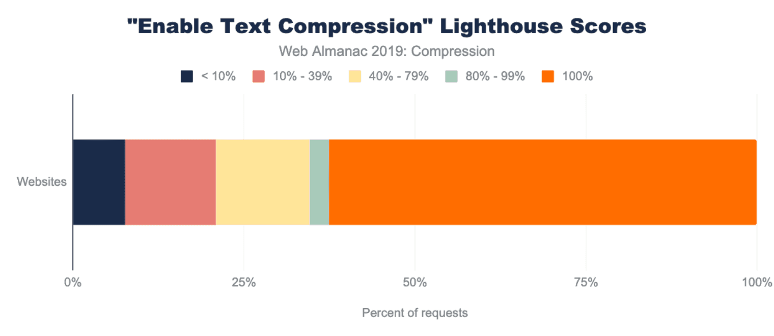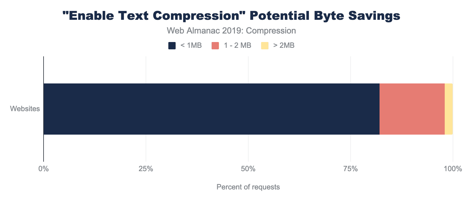 Lighthouse also indicates how many bytes could be saved by enabling text-based compression. Of the sites that could benefit from text compression, 82% of them can reduce their page weight by up to 1 MB!