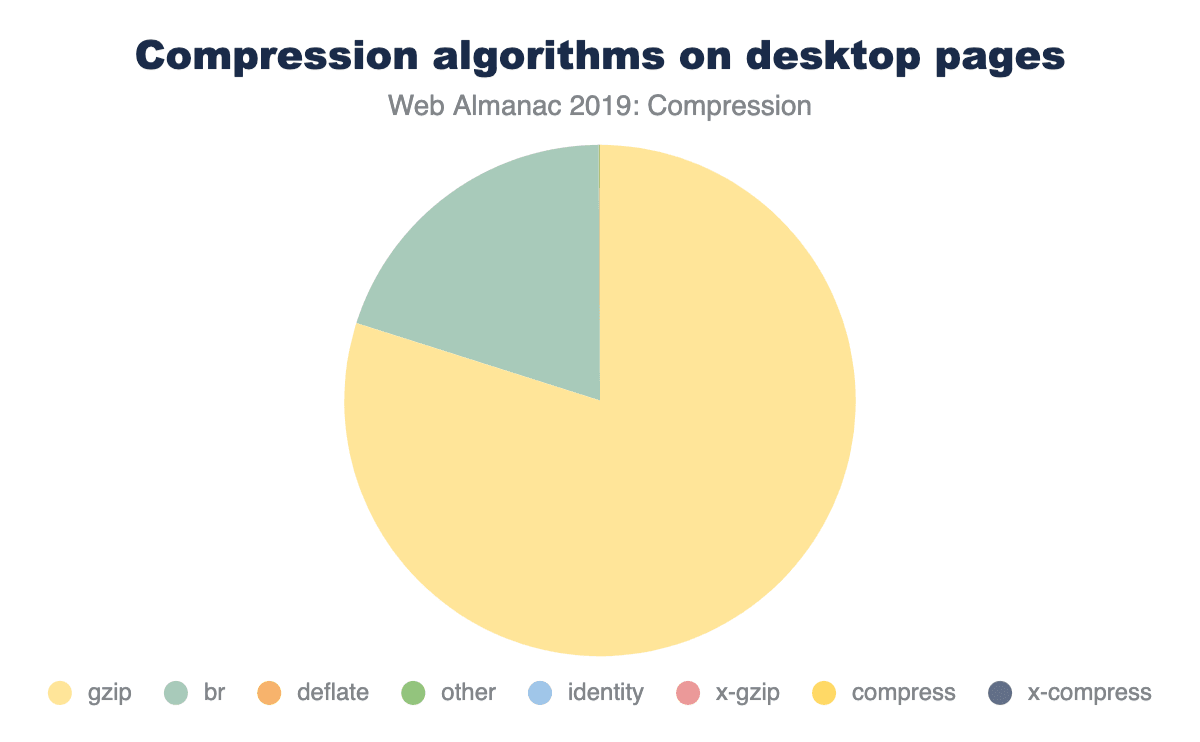 Of the resources that are served compressed, the majority are using either Gzip (80%) or Brotli (20%). The other compression algorithms are infrequently used.