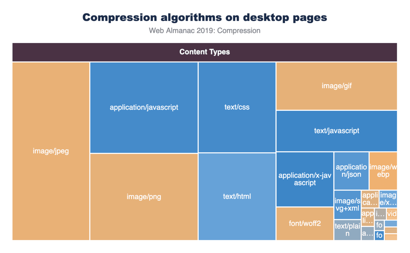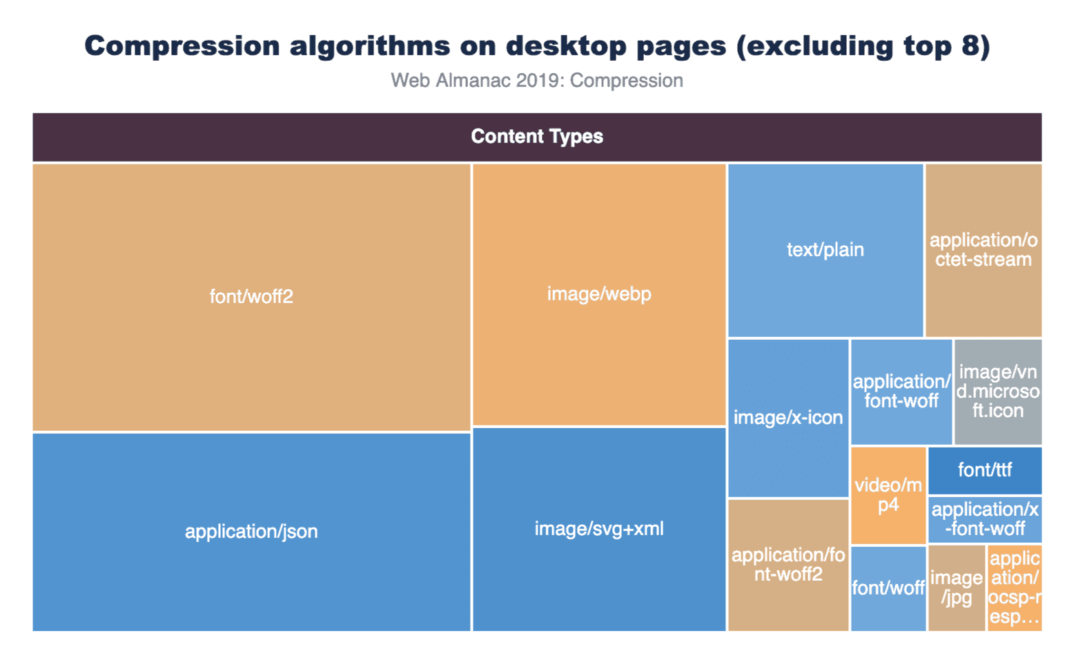 In the graph below, the top 25 content types are displayed with box sizes representing the relative number of requests. The color of each box represents how many of these resources were served compressed. Most of the media content is shaded orange, which is expected since Gzip and Brotli would have little to no benefit for them. Most of the text content is shaded blue to indicate that they are being compressed. However, the light blue shading for some content types indicate that they are not compressed as consistently as the others.