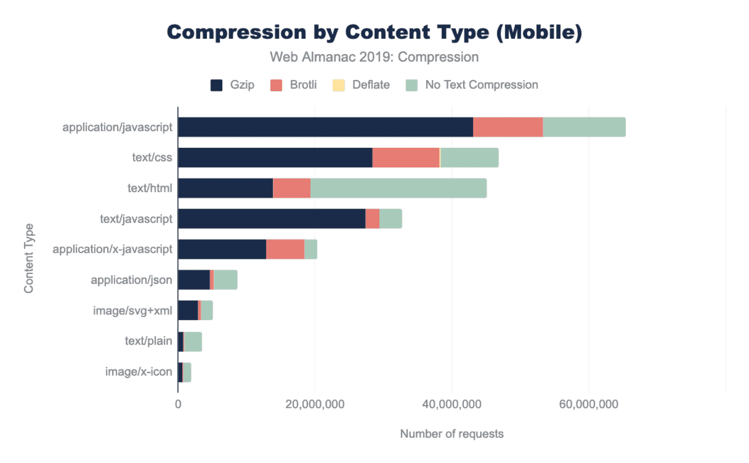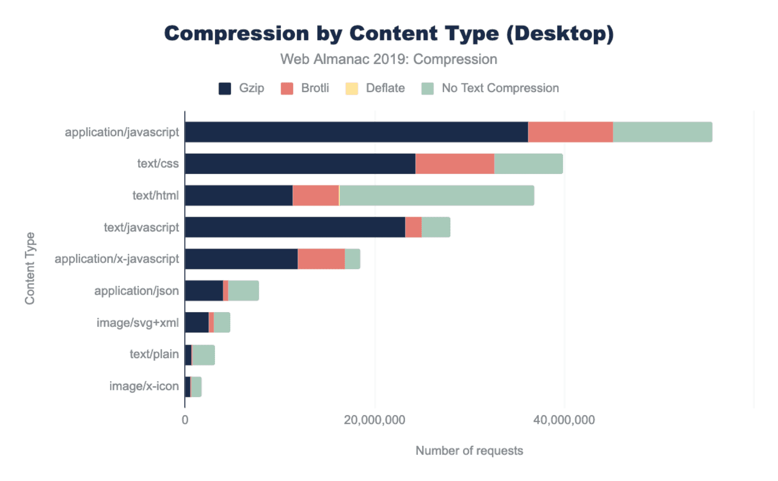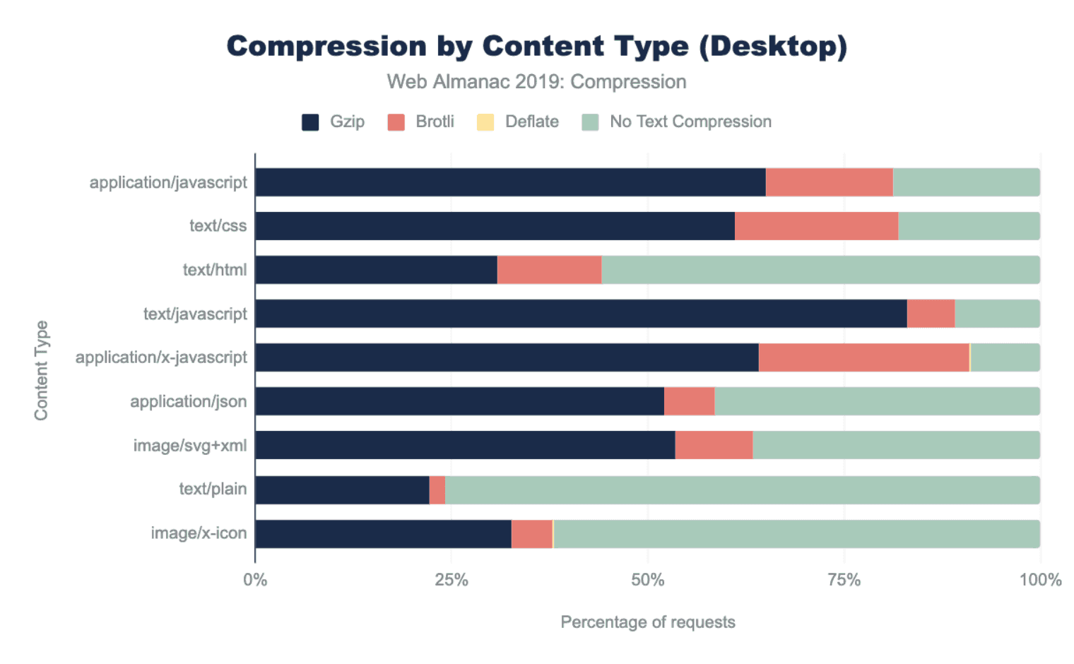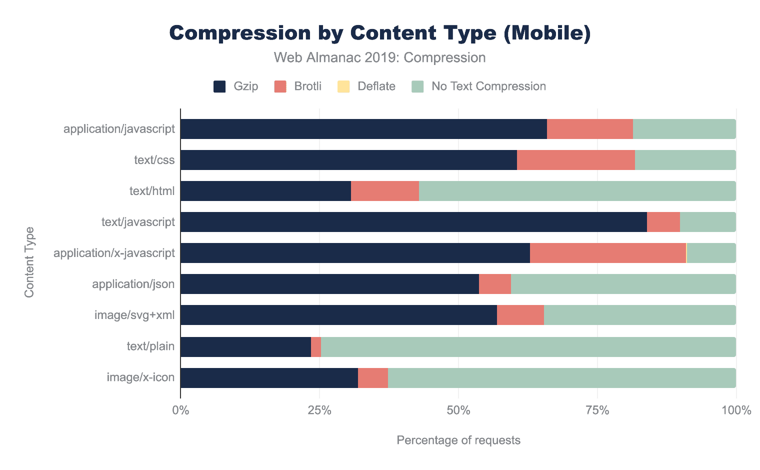 While many sites are making good use of HTTP compression, there is still room for improvement, particularly for the text/html format that the web is built upon! Similarly, lesser-understood text formats like font/ttf, application/json, text/xml, text/plain, image/svg+xml, and image/x-icon may take extra configuration that many websites miss.