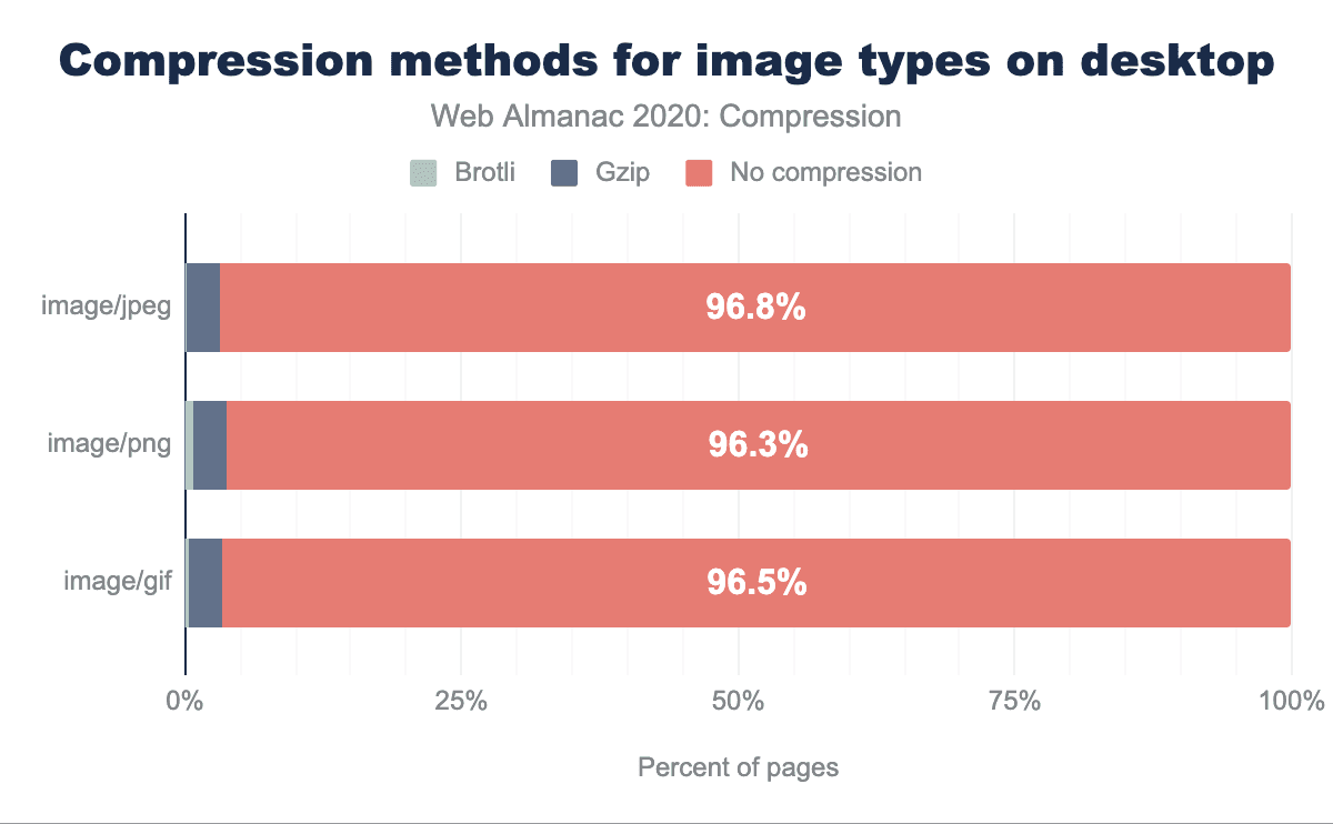 For image-based assets text-based compression is less useful and not widely employed. The data shows that the percent of image responses that employ either Brotli, or Gzip is very low, less than 4%. For more info on non text-based assets, check out the Media chapter.