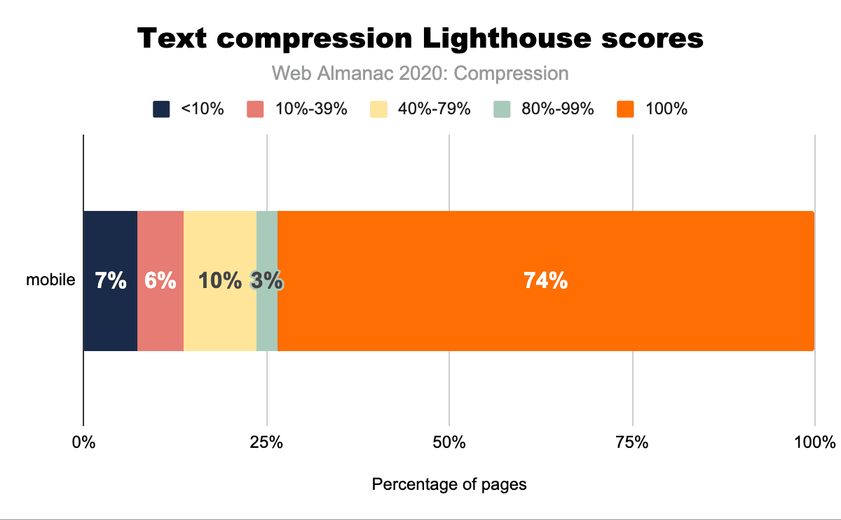 Compared with last year’s Almanac, there is a clear trend towards using more text compression. The number of responses that don’t use any text compression went down a little more than 2%, while at the same time the use of Brotli has increased by almost 2%. The Lighthouse scores have improved significantly.