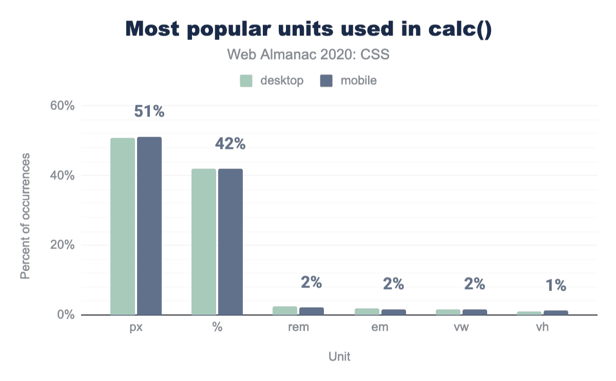 calc() is primarily used for lengths, with 96% of its usage being concentrated in properties that accept <length> values, and 60% of that (58% of total usage) on the width property!