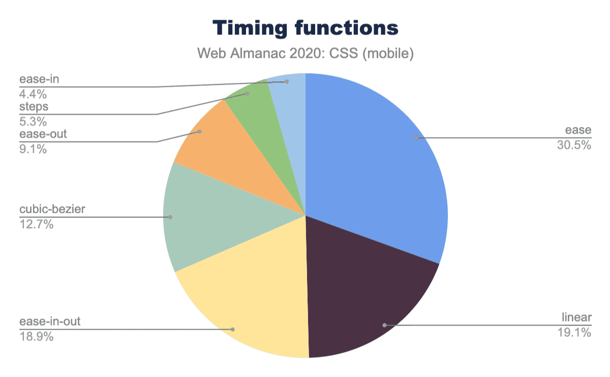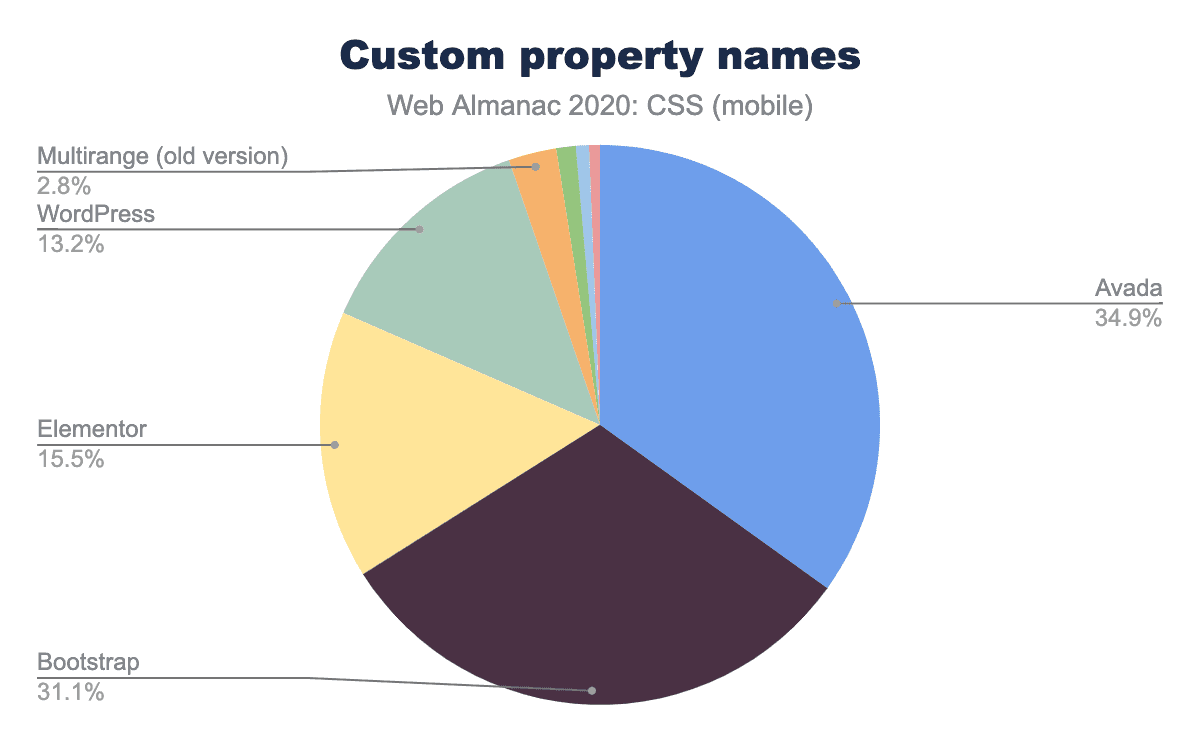 Similarly, in our conference talks, we often tend to focus on complicated, elaborate use cases that make heads explode and Twitter feeds fill with “CSS can do that?!”. However, it turns out most CSS usage in the wild is fairly simple. CSS Variables are mostly used as constants and rarely refer to other variables, calc() is mostly used with two terms, gradients mostly have two stops and so on.
