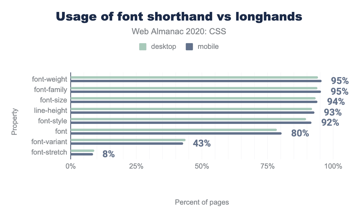 The font shorthand is fairly popular (used 49 million times on 80% of pages) but used far less than most of its longhands (except font-variant and font-stretch). This indicates that most developers are comfortable using it (since it appears on so many websites). Developers often need to override specific typographic aspects on descendant rules, which likely explains why the longhands are used so much more.