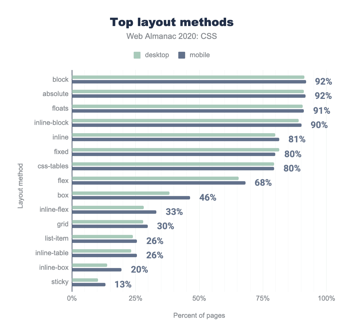 Overall, what we observed was a web in two different gears when it comes to CSS adoption. In our blog posts and Twitter bubbles, we tend to mostly discuss the newest and shiniest, however, there are still millions of sites using decade-old code. Things like vendor prefixes from a bygone era, proprietary IE filters, and floats for layout, in all their clearfix glory. But we also observed impressive adoption of many new features—even features that only got support across the board this very year, like min() and max(). However, there is generally an inverse correlation between how cool something is perceived to be and how much it is actually used; for example, cutting-edge Houdini features were practically nonexistent.