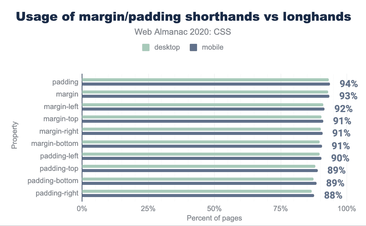 padding is 93% on desktop, 94% on mobile, margin is 93% and 93% respectively, margin-left is 91% and 92%, margin-top is 90% and 91%, margin-right is 90% and 91%, margin-bottom is 90% and 91%, padding-left is 90% and 90%, padding-top is 88% and 89%, padding-bottom is 88% and 89%, and padding-right is 87% and 88%.margin & padding shorthands and their longhands.