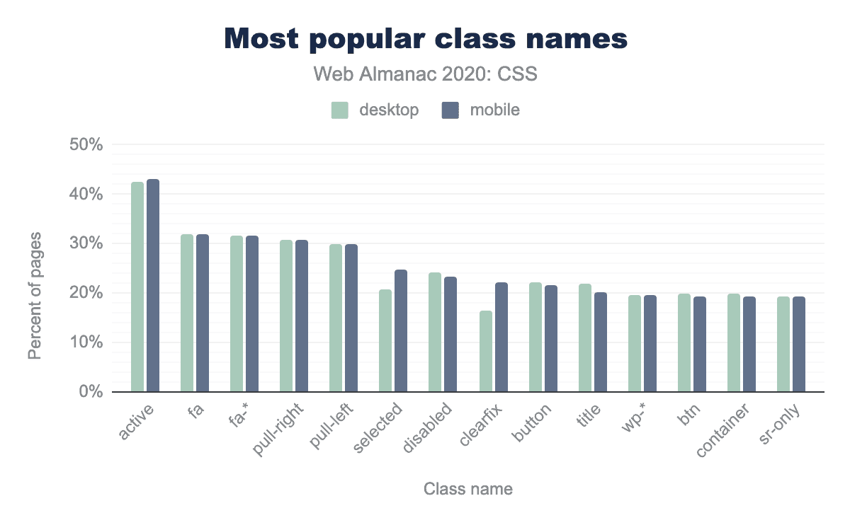 However, once we collapsed fa-* and then wp-* classes (which come from WordPress, another exceedingly popular piece of software), we got more meaningful results. Omitting these, state-related classes seem to be most popular, with .active occurring in nearly half of websites, and .selected and .disabled following soon after.