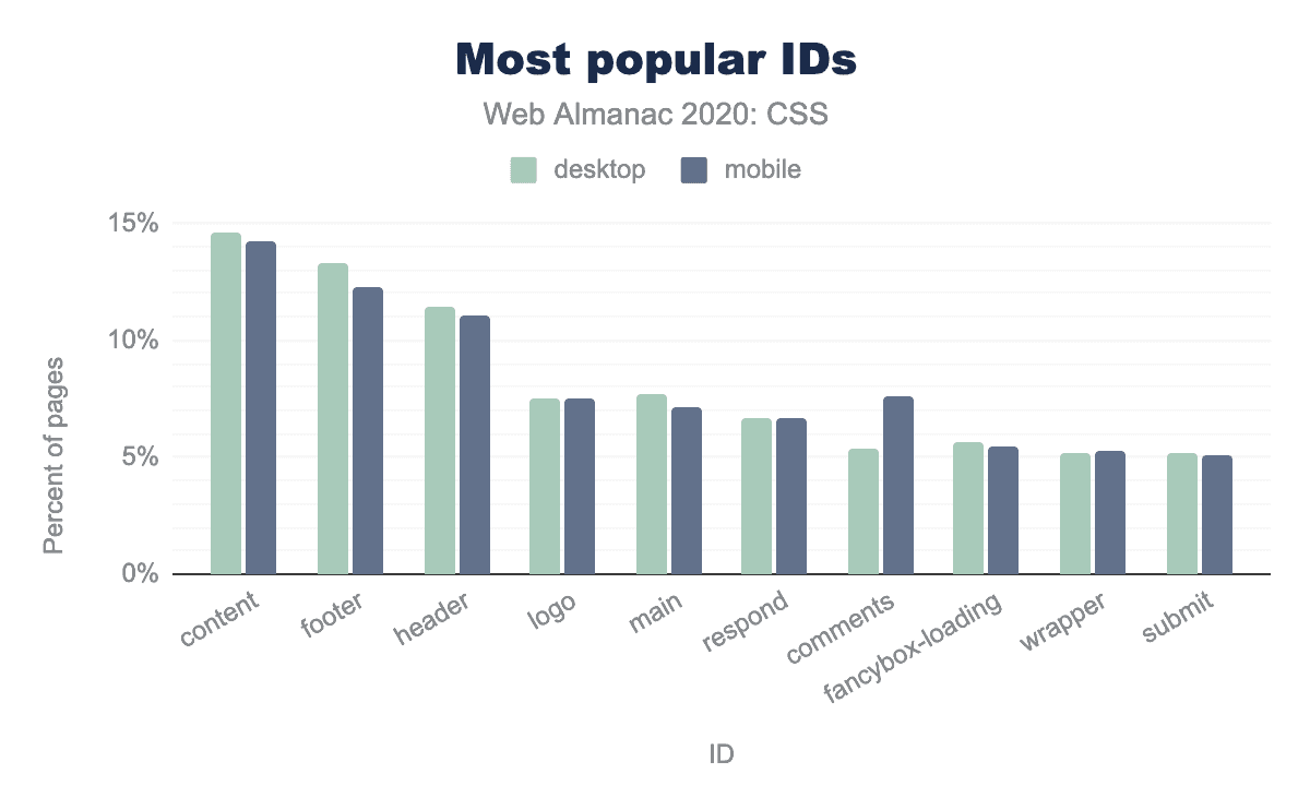 content at 14% of pages. The footer and header IDs have slightly smaller adoption. The logo, main, respond, comments, fancybox-loading, wrapper, and submit IDs have between 5 and 10% adoption on pages. The only notable difference between desktop and mobile is the comments ID used on about 8% of mobile pages but only 5% of desktop pages.IDs can also be used to intentionally reduce or increase specificity. The specificity hack of writing an ID selector as an attribute selector ([id="foo"] instead of #foo to reduce specificity) was surprisingly rare, with only 0.3% of pages using it at least once. Another ID-related specificity hack, using a negation + descendant selector like :not(#nonexistent) .foo instead of .foo to increase specificity, was also very rare, appearing in only 0.1% of pages.