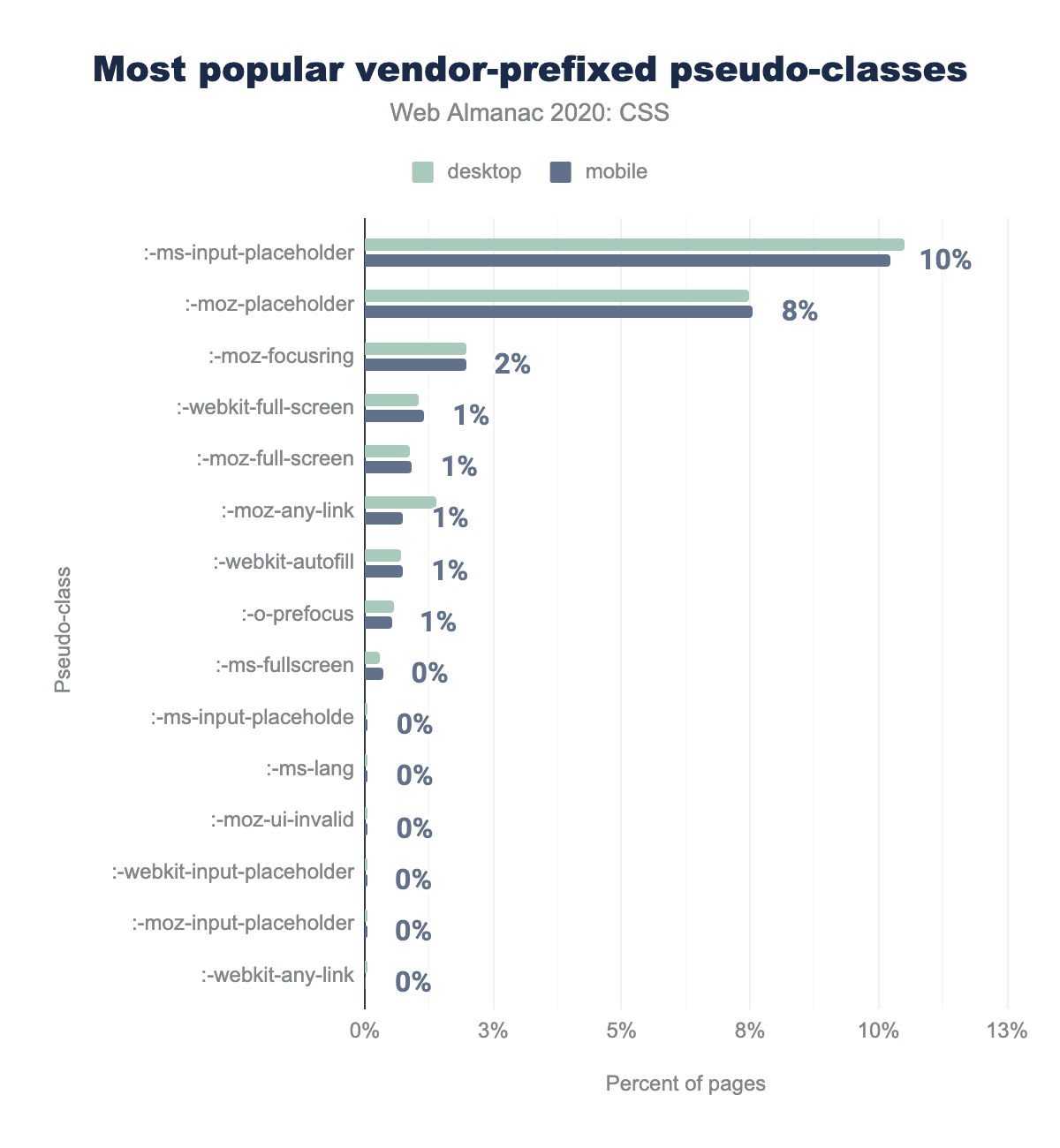-webkit makes up 49% of vendor prefix usage on mobile pages, -moz 23%, -ms 19%, -o 8%, -khtml 1%, and 0% for -pie, -js, and -ie. Desktop is similar.Prefixed pseudo-classes are not nearly as common as properties, with none of them being used in more than 10% of pages. Nearly two thirds of all prefixed pseudo-classes overall are for styling placeholders. In contrast, the standard :placeholder-shown pseudo-class is barely used, encountered in less than 0.34% of pages.