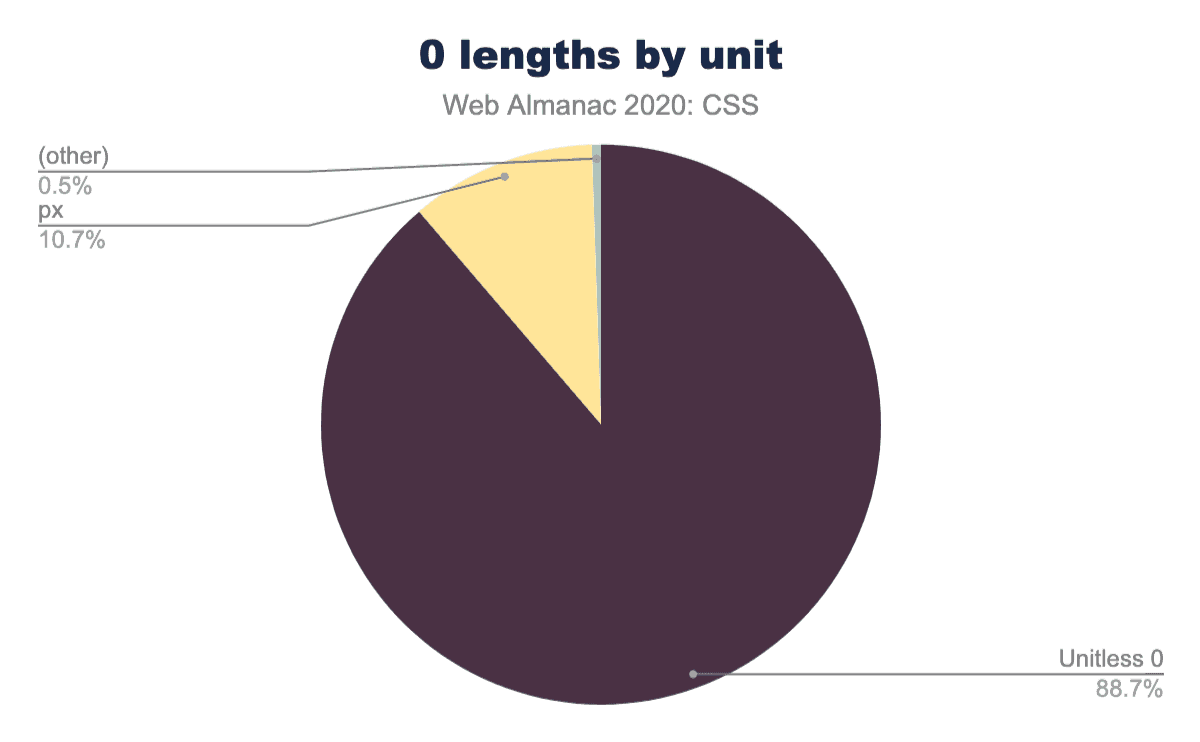 em is used overwhelmingly on 87.3% of instances, followed by rem at 12.2, ch at 0.4%, and ex at 0.2% of instances on mobile pages.Lengths are the only types of CSS values for which we can omit the unit when the value is zero, i.e. we can write 0 instead of 0px or 0em etc. Developers (or CSS minifiers?) are taking advantage of this extensively: Out of all 0 values, 89% were unitless.
