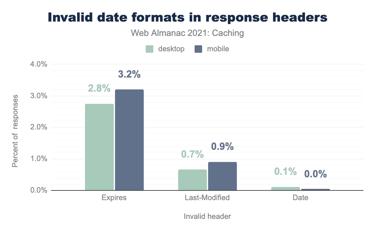 Between 2020 and 2021, the percent using invalid Date improved by 0.5% but worsened for Last-Modified and Expires showing that it was related to how the date was set on caching.