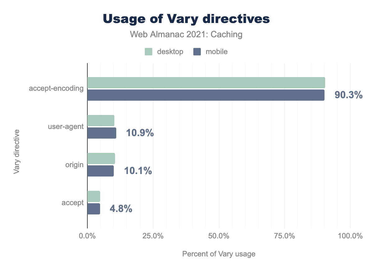 The most popular Vary header is Accept-Encoding with 90.3% usage, followed by User-Agent with 10.9%, Origin with 10.1%, and Accept with 4.8%.