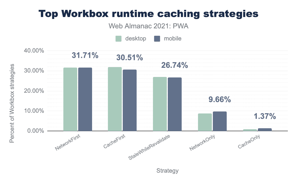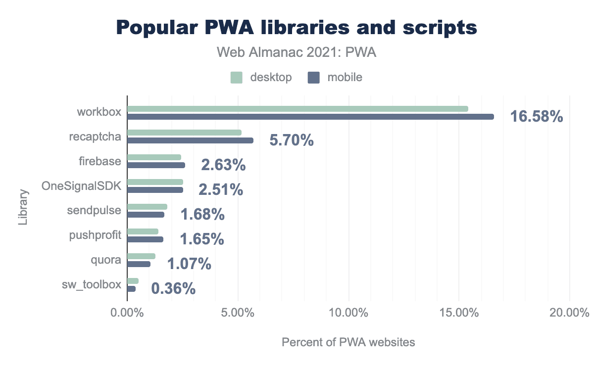 It’s also important to note that the Workbox predecessor sw_toolbox, which had 13.92% of usage in desktop and 12.84% in mobile last year dropped to 0.51% and 0.36% respectively this year. This is in part due to the fact that sw_toolbox was deprecated in 2019. It might have taken some time for some popular frameworks and build tools to remove this package, so we are seeing the drop in adoption more clearly this year. Also, our measurement has changed compared to 2020, by adding more sites, which made this metric decrease even more, making it difficult to do a direct year on year comparison.
