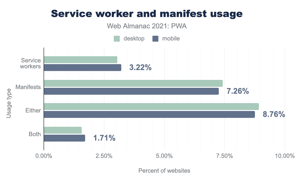 In this year’s PWA chapter, we’ll focus on all the measurable aspects of a PWA: usage of service workers and its related APIs, web app manifests, and the most popular libraries and tools to build PWAs. A PWA can use all or some of these functionalities. We’ll look at the level of adoption of each component and API to get an idea of the level of penetration of these technologies in the web ecosystem.