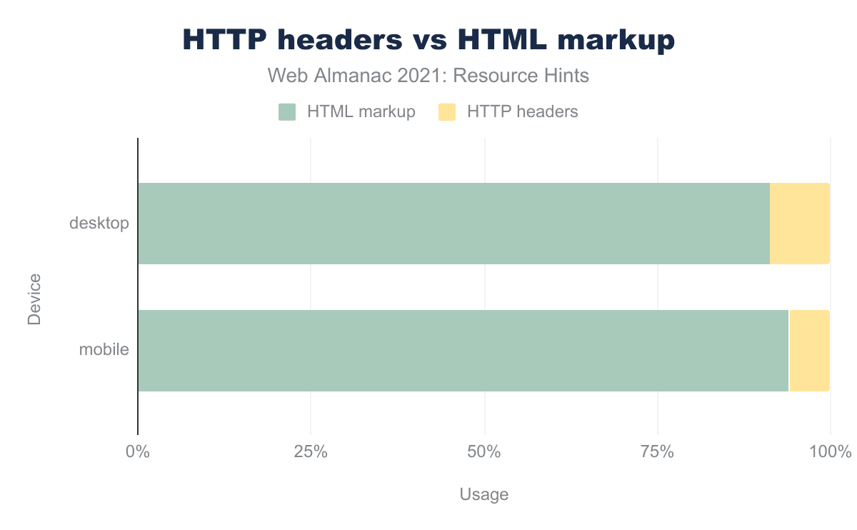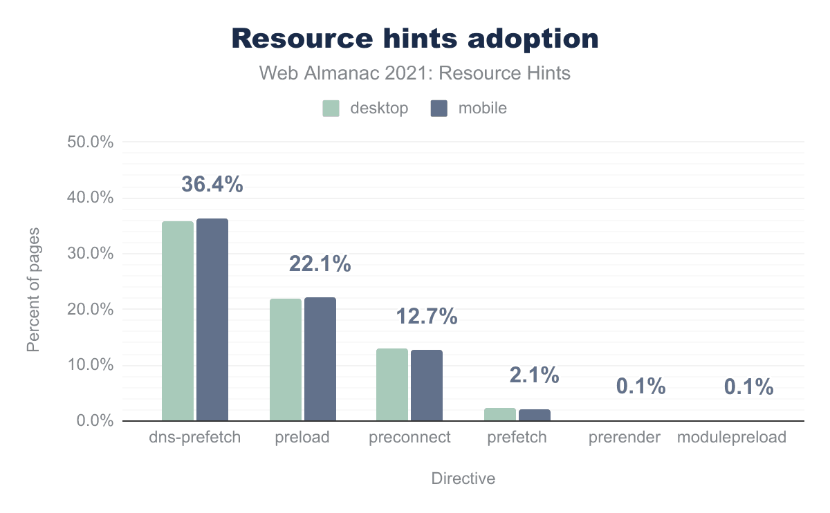 dns-prefetch has 36.4% adoption on mobile and 35.7% on desktop. preload has 22.1% adoption on mobile and 22.0% on desktop. preconnect has 12.7% adoption on mobile and 12.9% on desktop. prefetch has 2.1% adoption on mobile and 2.4% on desktop. prerender has 0.1% adoption on mobile and 0.1% on desktop. modulepreload has 0.1% adoption on mobile and 0.1% on desktop.The most widely used resource hint is dns-prefetch (36.4% on mobile); which is unsurprising, considering it was introduced in 2009. With the widespread use of HTTPS, in many cases you should replace it with preconnect (12.7% on mobile), if you are certain that you will be connecting to that domain. Considering that the preload hint is comparatively new, first appearing in Chrome in 2016, it is the second most widely adopted resource hint (22.1% on mobile) and is seeing constant growth year-on-year—a testament to the importance and flexibility of this directive.