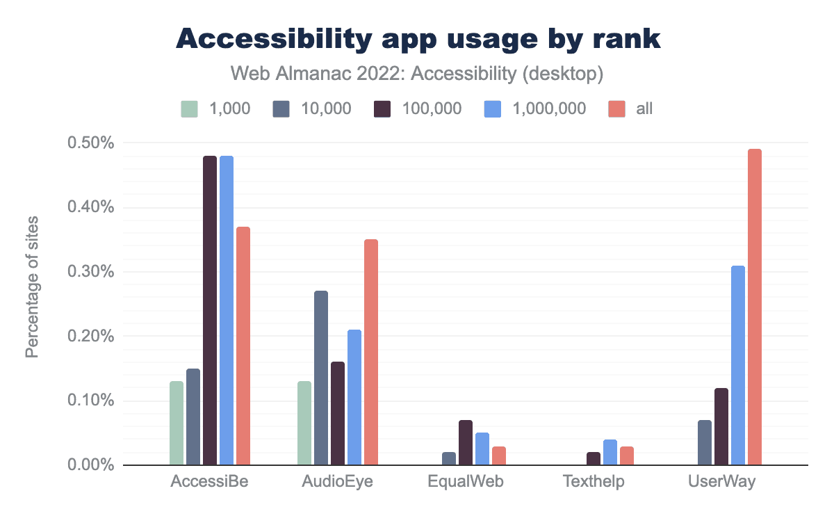Usage of overlays, and accessibility apps generally, is more rare for high-traffic websites. For sites ranked in the top 1,000 by visits, only 0.3% – or 3 websites – use an overlay.