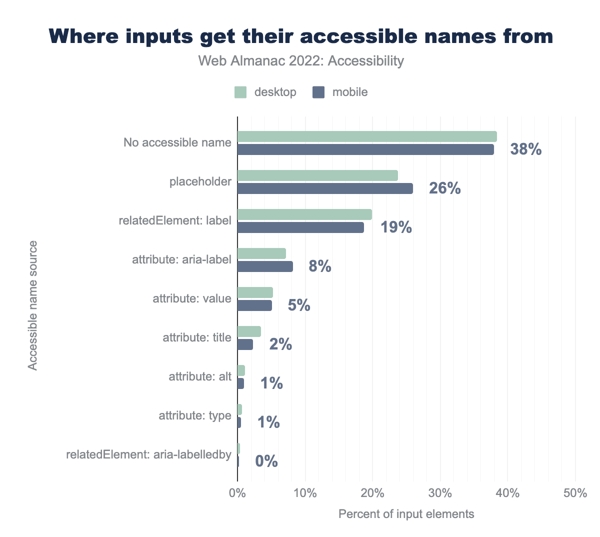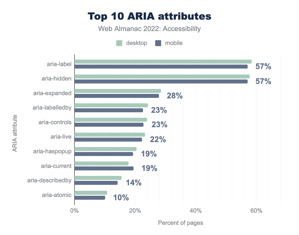 We found that 58% of desktop pages and 57% of mobile home pages had at least one element with the aria-label attribute, making it the most popular ARIA attribute for providing accessible names. We found that 24% of desktop pages and 23% of mobile pages had at least one element with the aria-labelledby attribute. This could mean that more elements now have accessible names but it may also be indicative that more elements now lack a visual label which can be problematic for people with cognitive disabilities and voice to text users (see <label> element).