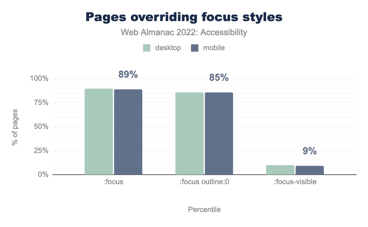 We found that 86% of websites add :focus {outline: 0}. This removes the default outline that browsers use for the focused interactive element. In some cases, they are overridden using some custom styling, but not always. This makes it impossible for users to determine which element has focus which in turn hinders navigation. Sara Soueidan has a great article on how to design WCAG-compliant focus indicators. However, it’s exciting to see that 9% of websites have :focus-visible compared to only 0.6% last year. This is definitely a step in the right direction.