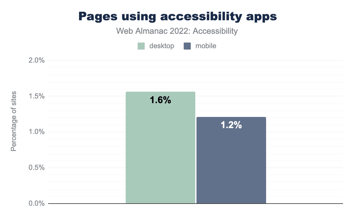 We found that 1.6% of desktop websites use one of 22 specific accessibility apps we could detect in 2022. This is a clear rise compared just under 1% in 2021.