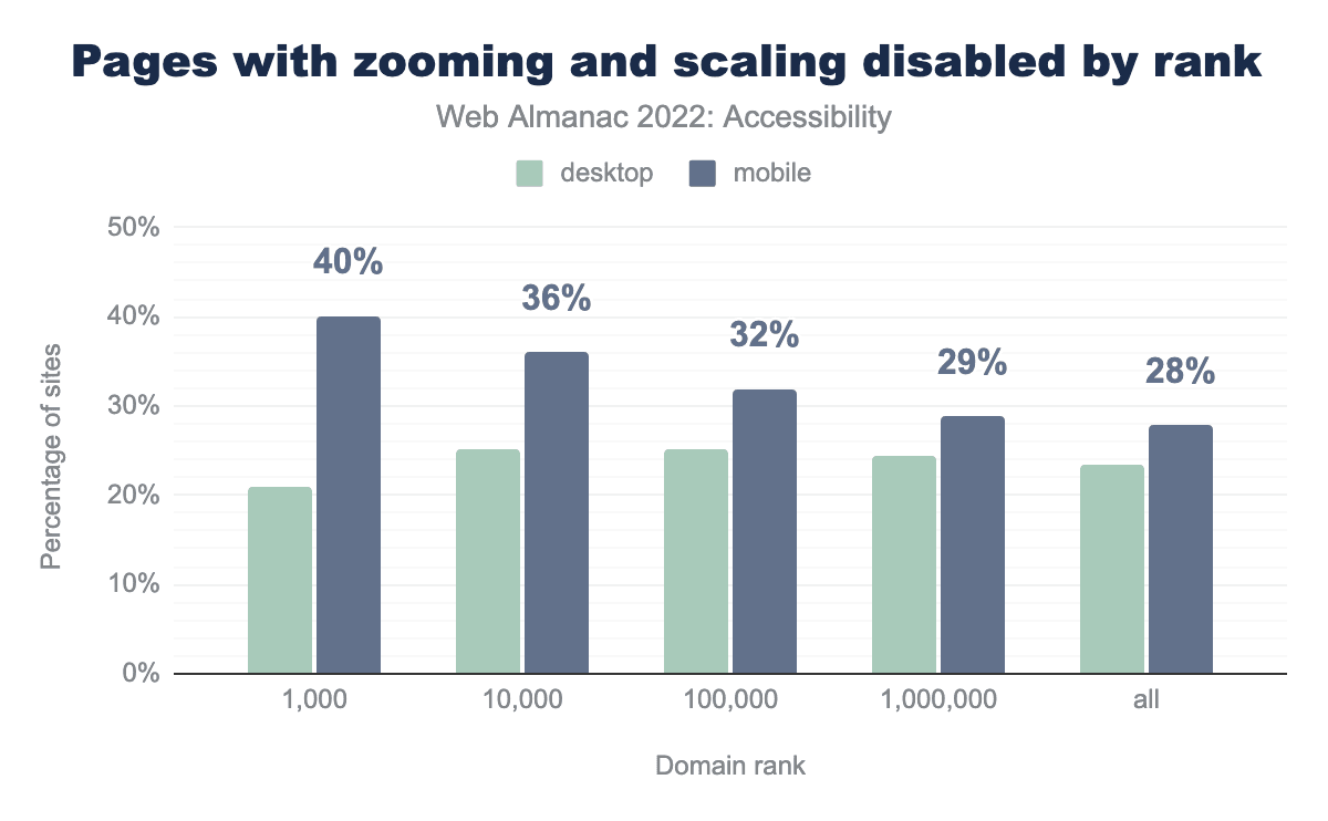 Of the top 1,000 most visited sites, 21% of desktop sites and 40% of mobile sites are built using code that attempts to disable user zooming or scaling. This means that the percentage of sites with zooming disabled is almost double on mobile compared to desktop. It’s really important to not disable zooming on any device. To combat this, browsers have begun to override developers’ attempts to disable zoom. Manuel Matuzović wrote an article talking about the concerns with disabling zoom and user settings in browsers.