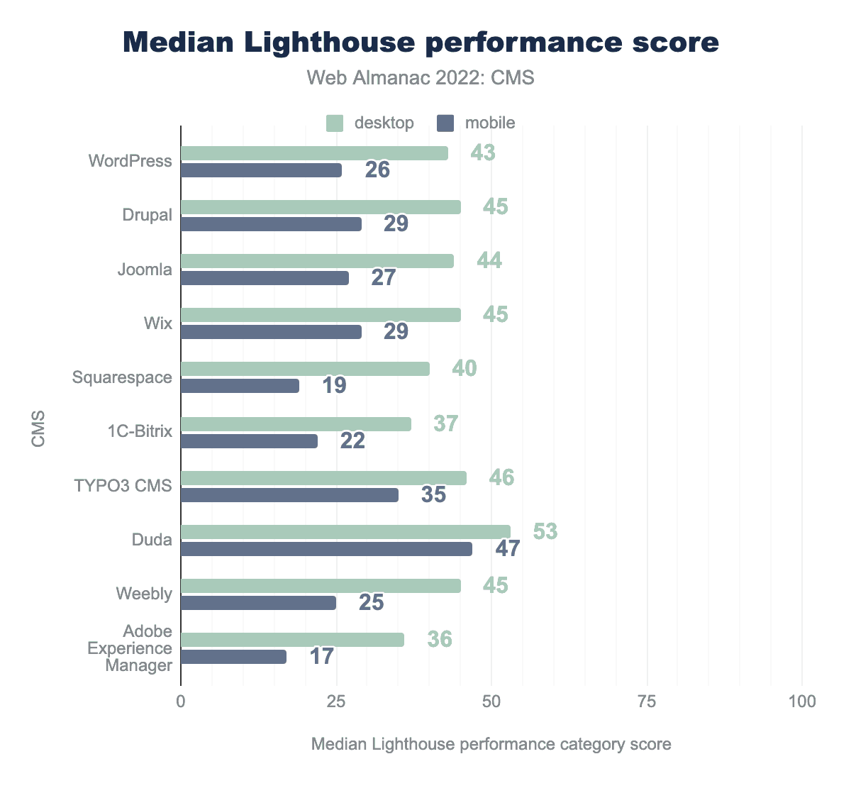 We can see that the median performance scores for most platforms on mobile are low and range from about 19 to 35. Duda at 47 is the exception. As Philip Walton noted in 2021, this does not directly imply bad results in mobile field data, but it does imply that all platforms have room for improvement, especially on low-end devices with network connections similar to those Lighthouse attempts to emulate.