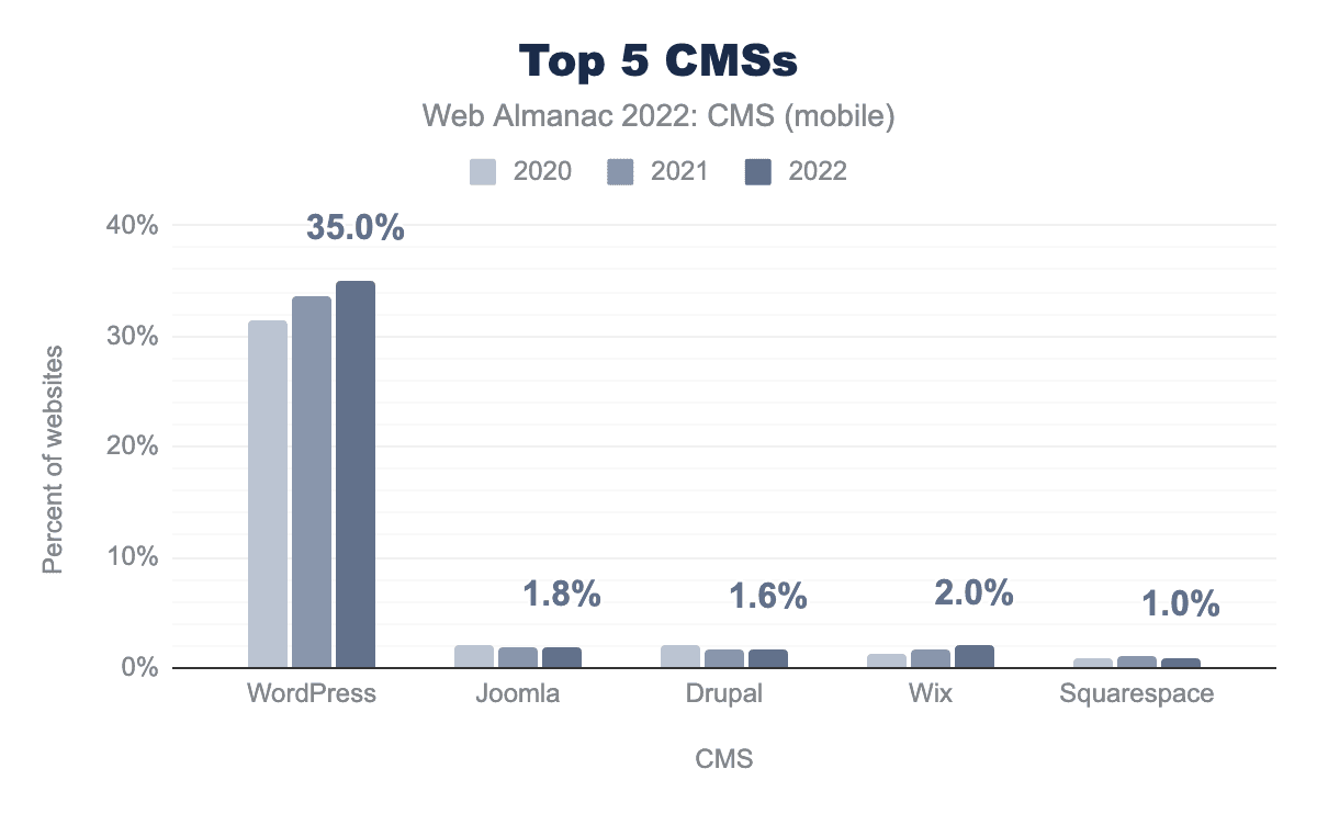 Among all websites that use an identifiable CMS, WordPress sites account for the majority of the relative market share—with over 35% adoption on mobile—followed by Wix (2%), Joomla (1.8%), Drupal (1.6%), and Squarespace (1.0%).