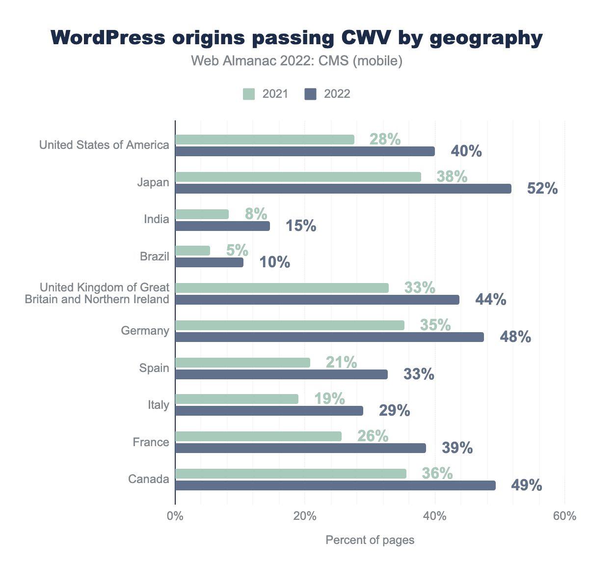 Next, we looked at the number of WordPress origins with passing scores for Core Web Vitals, but this time we broke them down by geography, mobile device usage, and in comparison with our 2021 results.