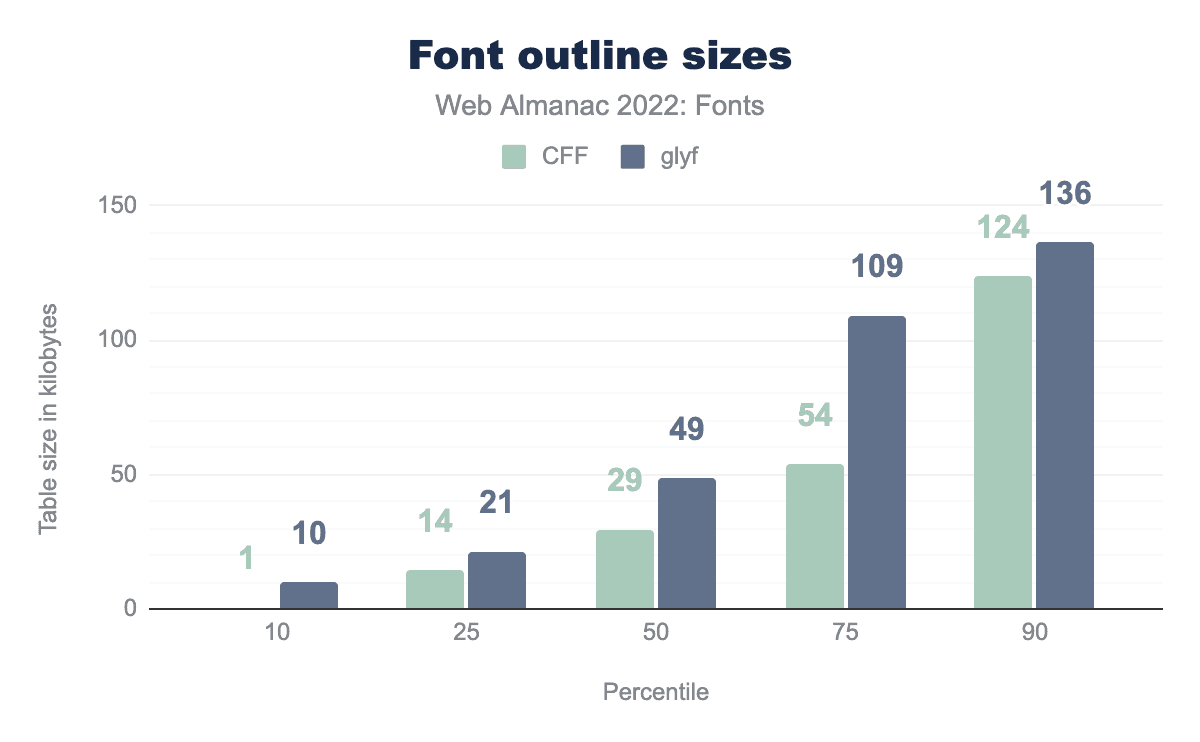 CFF is 1 KB and glyf 10 KB, at the 25th percentile it’s 14 and 21 respectively, at the 50th percentile it’s 29 and 49, at the 75th percentile it’s 54 and 109, and finally at the 90th percentile CFF is 124 KB and glyf 136 KB.On average, CFF does indeed produce a smaller table size. However, the reality is more nuanced, as it doesn’t take compression into account—the table sizes are recorded after the font has been uncompressed.