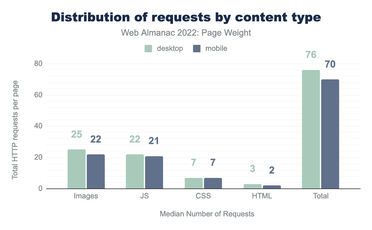 It’s not only the total number of bytes requested—the number of requests made to create a page can affect the performance of a page. We, therefore, consider this as part of page weight.