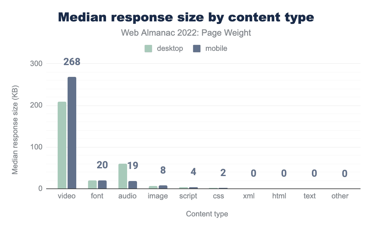 While images and JavaScript remain the largest contributors to byte size, 2022 revealed surprising increases such as a greater prevalence of byte-heavy videos on mobile and the median font byte size being higher than that of its image counterpart.
