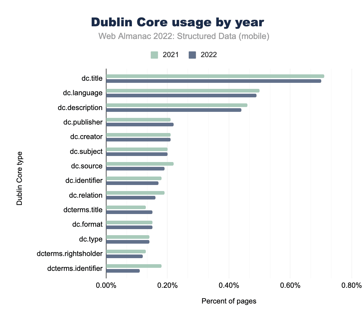 Dublin Core attribute type usage remains very similar across the most prominent attribute types. A notable exception is dcterms.identifier, going from 0.11% in 2021 to 0.18% in 2022 for mobile pages. Though small in percentage, this totals to a usage count of nearly 15,000 in our set. This increase was also seen for desktop pages, though not as substantial, going from 0.14% in 2021 to 0.18% in 2022.