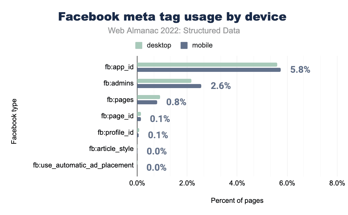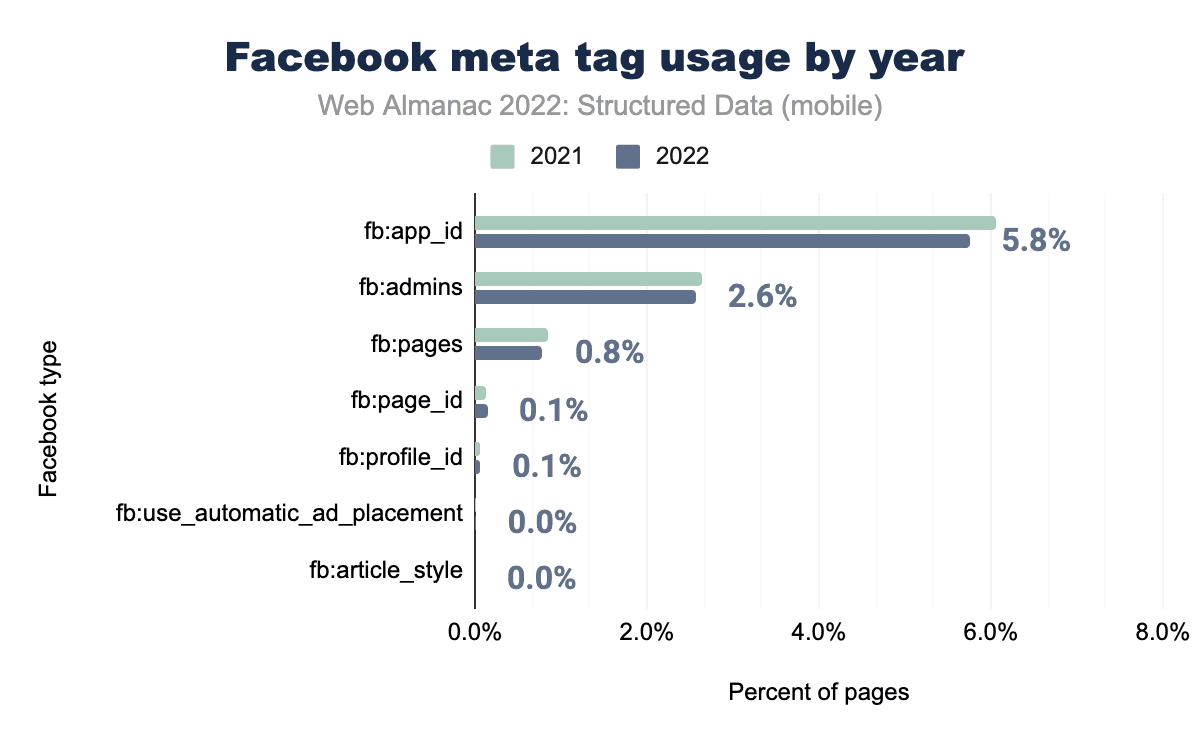 This is true for desktop pages too, with the exception of fb:pages at a slight increase from 0.90% in 2021 to 0.92% in 2022. The meta tag fb:pages_id sees a slight increase on mobile and desktop pages alike, but overall facebook meta tag usage has seen a decline for both mobile and desktop pages since last year.