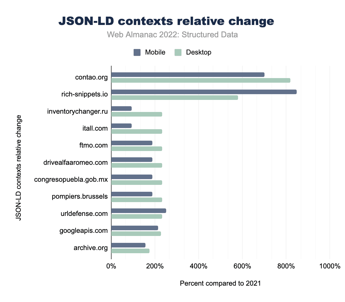 For JSON-LD contexts, schema.org is by far the largest contributor, with over 6,000 times as many appearances for desktop pages and over 3,500 times as many appearances for mobile pages than the second largest contributor, googleapis.com. With that said, googleapis.com’s appearances more than doubled for both desktop and mobile pages, compared to schema.org’s more modest increase to 108% of last year’s numbers. In terms of top growers, contao.org and rich-snippets.io take the top spots with contao.org’s desktop page increase of 819% and rich-snippets.io’s mobile increase of 849%. Contao.org ranks 4th in total entries, while rich-snippets.io ranks at 8th.
