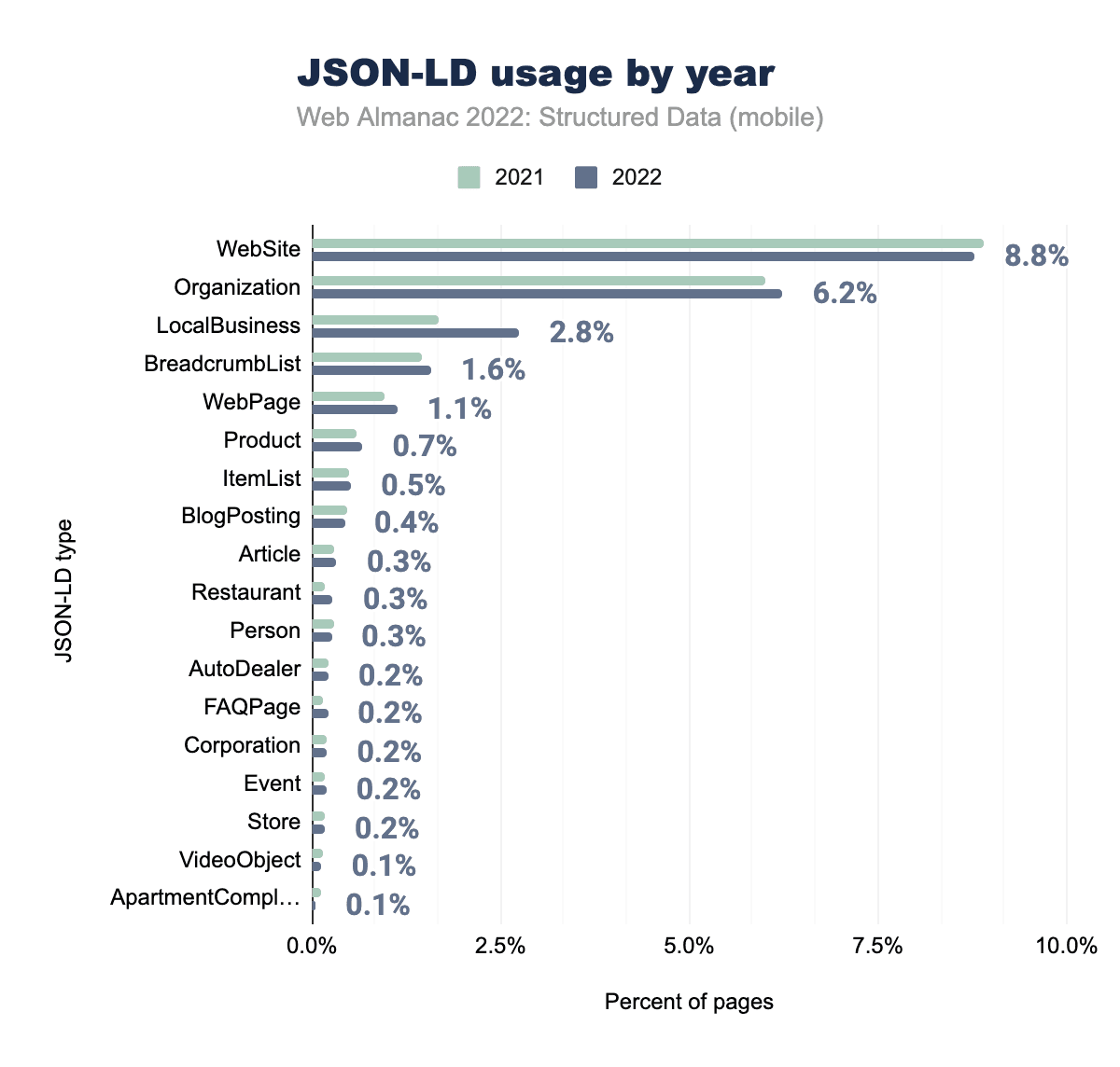 JSON-LD types continue to be mostly similar with a few notable increases over the previous year. Namely, these are LocalBusiness (which has increased to 2.8% of pages in our set) and Restaurant (which has increased to 0.3% of pages in our set).