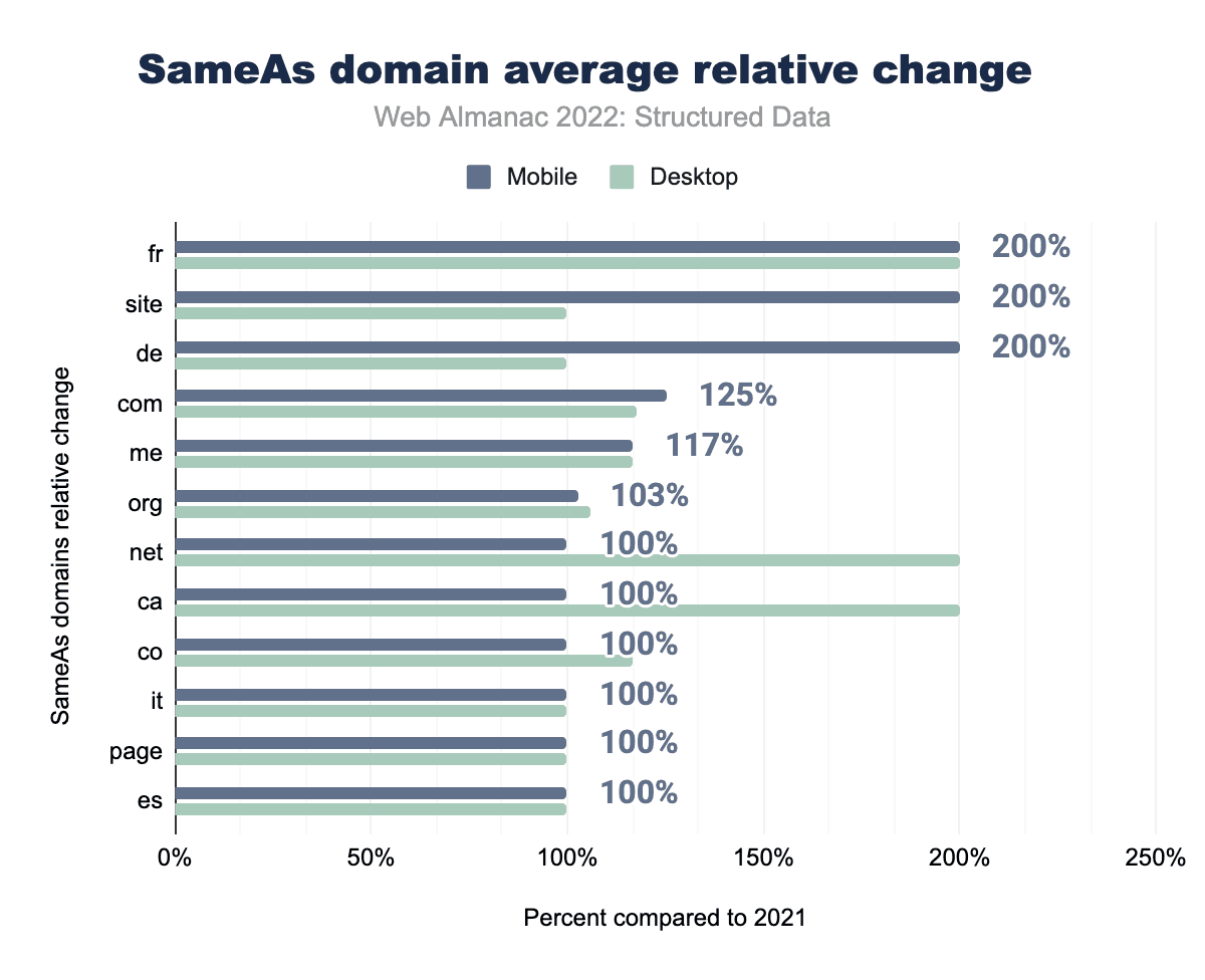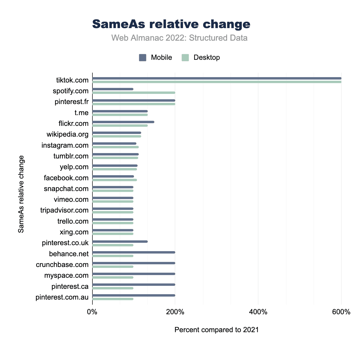 It is insightful to look at the SameAs entries and how they change over time. TikTok has seen a huge increase with 2022 showing its appearance on six times as many pages relative to our set compared to 2021. This change is equal for both desktop and mobile pages. Pinterest, and the various domain names it has, make up for 3 of the top 5 largest growth for mobile pages in 2022. Mobile overall has seen a larger increase for SameAs entries than desktop, with Spotify being an exception with its desktop page appearances being doubled compared to 2021.