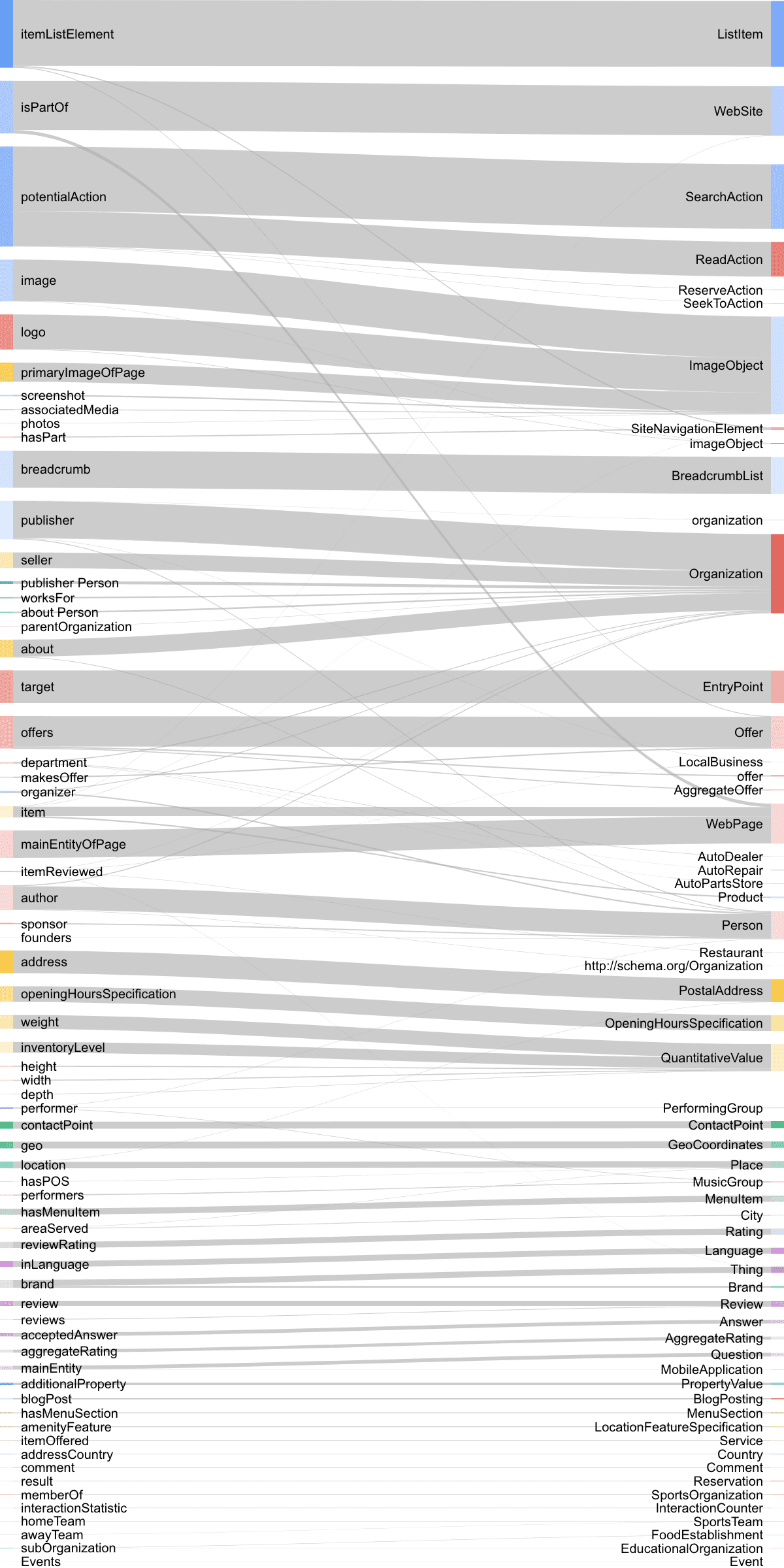 With this analysis we want to share a birds-eye overview of the most common types of relationships between entities and the subtle differences between let’s say Article and BlogPosting.