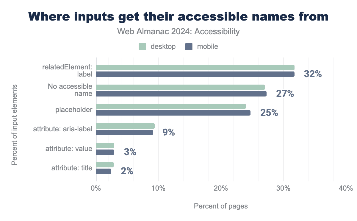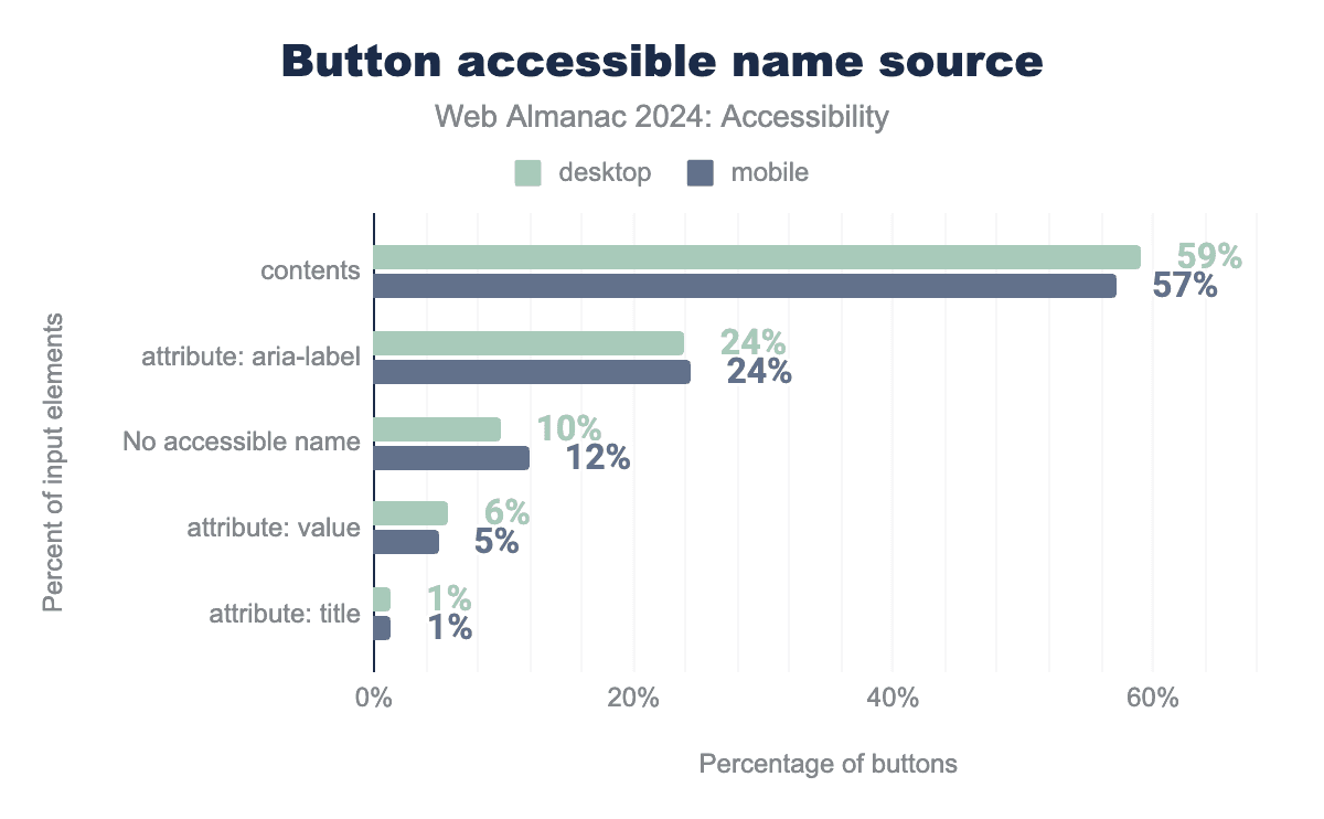 Our analysis shows that 63% of mobile websites and 64% of desktop websites utilize tabindex (up from 60% and 62% respectively). This attribute serves several purposes, which can affect accessibility: