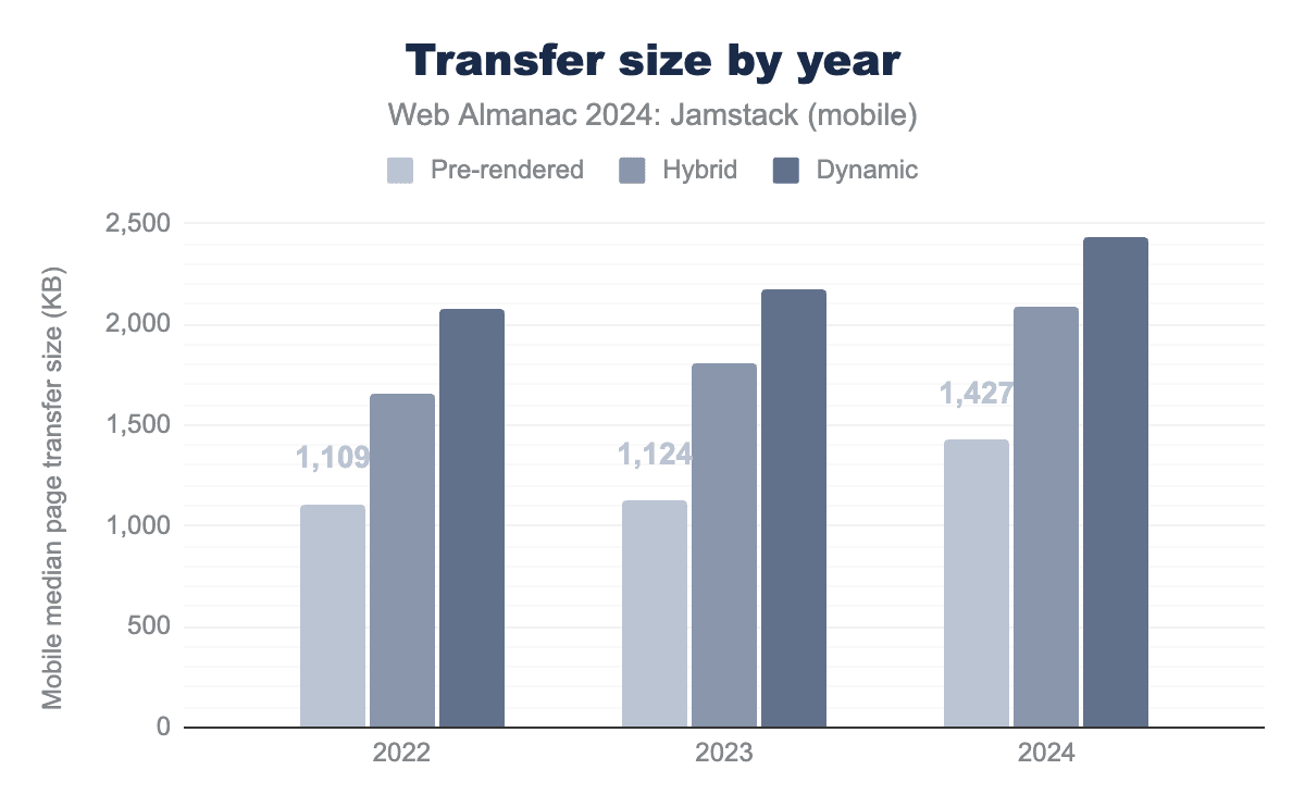 The jump between Prerendered and Hybrid sites likely reflects their different use cases with Prerendered sites more likely to be static, informational sites, while Hybrid sites might lean more into eCommerce and web applications which can lead to larger transfer sizes.