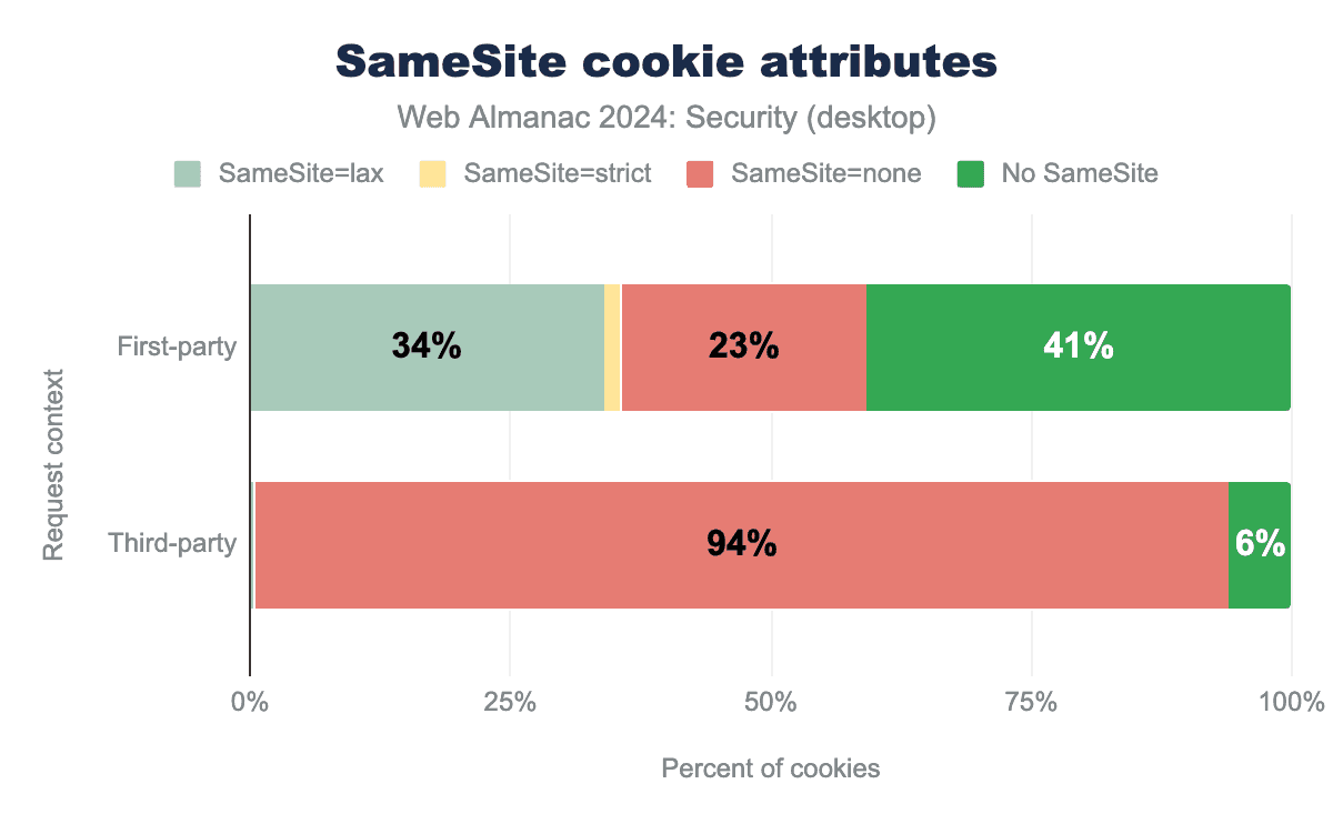 While the relative number of cookies with a SameSite attribute has increased compared to 2022, this rise is largely attributable to cookies being explicitly excluded from the same-site policy by setting SameSite=None.
