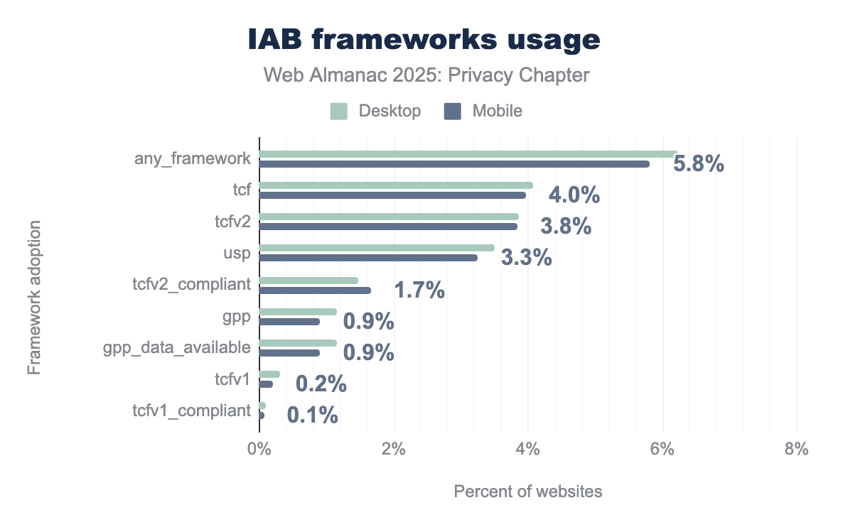 The deprecated TCFv1 has nearly disappeared, sitting at just 0.2% with only 0.1% compliant, indicating the industry has potentially migrated to v2. A notable addition this year is GPP, the IAB’s newer unified framework, which appears on 0.9% of sites. Encouragingly, gpp_data_available matches at 0.9%, meaning sites that have adopted GPP are actually using it to transmit user preferences rather than just loading the code.