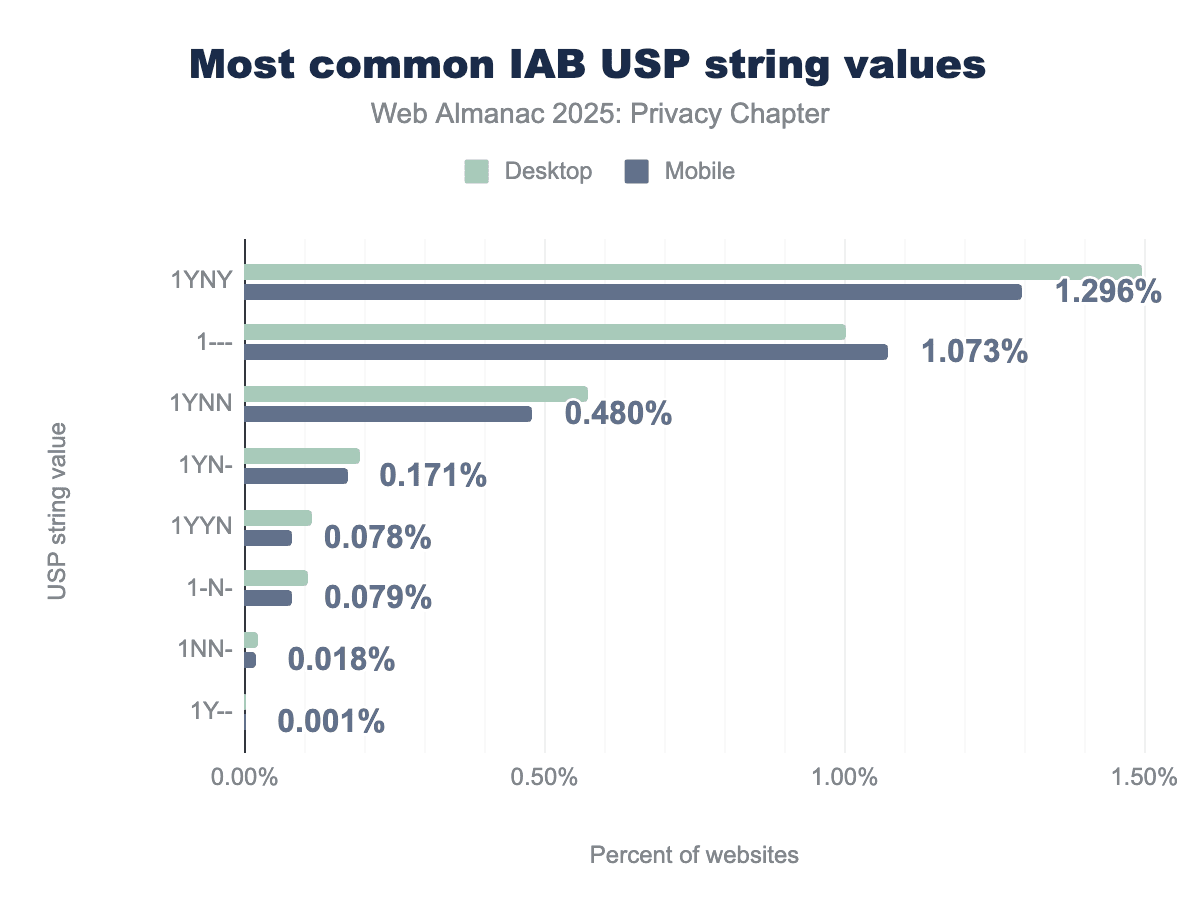 The most common USP string is 1YNY at 1.296%, indicating that notice was given, the user did not opt out, and the site is covered under the Limited Service Provider Agreement. The second most common value is 1--- at 1.073%, a placeholder string that provides no meaningful signal, suggesting many implementations are incomplete or default. We observed that sites showing 1YYN have configured their CMP to default new visitors to an opted-out state, a stricter-than-required privacy posture. The low prevalence (0.078%) indicates most sites follow CCPA’s standard opt-out model, where consent is assumed until explicitly revoked.