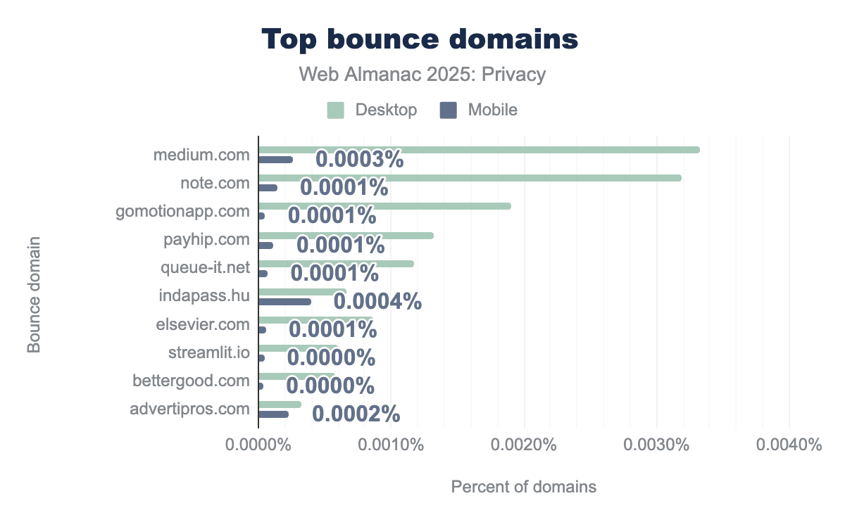 medium.com remains the most common bounce domain in the 2025 dataset at 0.0003%, followed by note.com and indapass.hu. Year-over-year, prevalence dropped significantly; for instance, medium.com fell from 0.009% to 0.0003%, and indapass.hu from 0.012% to 0.0004%. This decline likely reflects Chrome’s bounce tracking mitigations taking effect. Because the top domains (queue-it.net, payhip.com, medium.com) are legitimate functional services, the data suggests most observed behavior stems from necessary redirects rather than covert tracking.