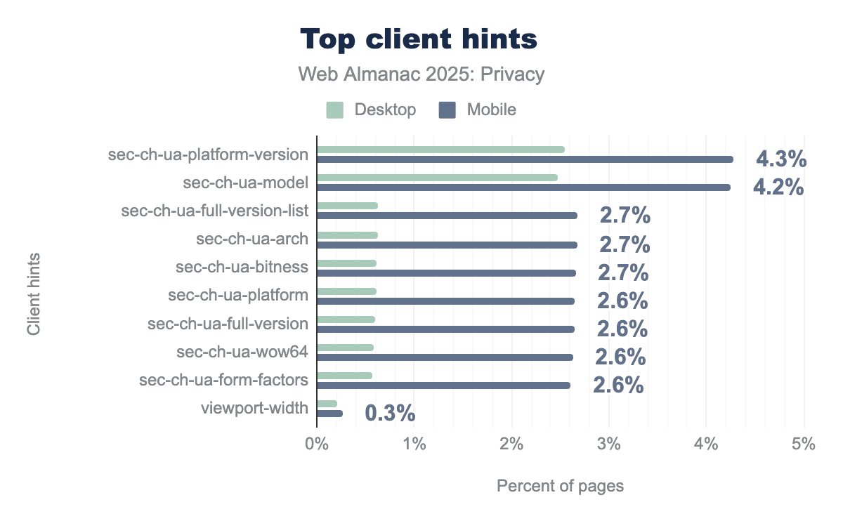 User-Agent Client Hints offer a privacy-conscious alternative to the traditional User-Agent string, allowing browsers to share device and browser information only when explicitly requested by servers. Instead of exposing a detailed fingerprint by default, sites must opt in to specific hints, reducing passive data leakage. In 2025, adoption sits at 3.3% for desktop and 5.1% for mobile, with mobile’s higher rate likely reflecting greater need for responsive design signals. This transition is now permanent; with Chrome 145 removing the UserAgentReduction policy, sites must migrate to User-Agent Client Hints for detailed browser or device information.