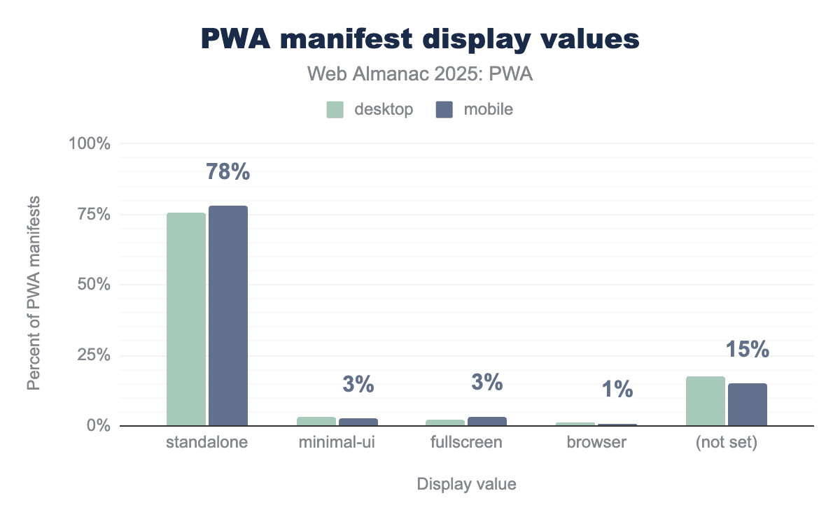 Most web apps (78%) opt for a standalone value for the display member. From the documentation, standalone “opens the app to look and feel like a standalone native app”. This is not surprising as the general intention of a web app for a developer would be to have the app look more native-like, removing the browser chrome and some other UX. On the end this is something that varies with the implementation, as for example in Chromium browsers you get a ... menu and on Firefox some browser UI like the URL bar still remains for installed apps.