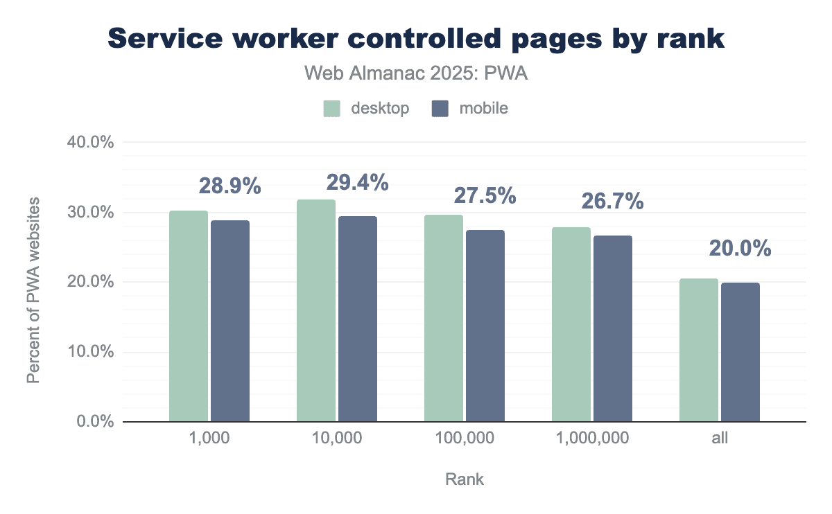 Service workers remain essential to allow advanced capabilities like background sync, offline support and push notifications to web apps. This year, the data suggest around one fifth of web properties are using service workers.