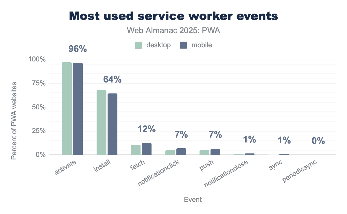 skipWaiting being used on approximately 68% of desktop PWA pages and 63% of mobile PWA pages.Looking at the most used service worker method, skipWaiting() has a notable use, with 68% usage on desktop and 63% on mobile. The browser will activate the service worker and replace the old one immediately. This implies developers are keen to ensure users don’t get stuck with stale assets. This is beneficial for applications that require frequent updates, like dashboards and messaging apps. It basically helps users get the latest version of the application right away.