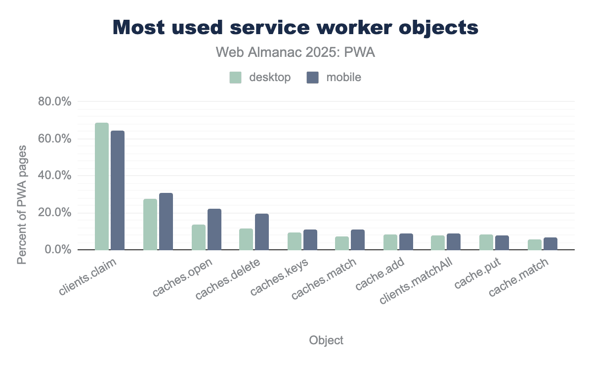 clients.claim is the most widely used object, appearing on approximately 67 percent of desktop PWA pages and 63 percent of mobile PWA pages. Other common objects include caches.open and caches.delete, which are notably more prevalent on mobile devices than on desktop.The most used service worker objects are clients, caches and cache. For clients, this can be expected as it is the way to tell the service worker to take control of all open pages by calling clients.claim(). Regarding caches, management methods appear on top, also not surprising considering that these are the methods that developers would use to make sure their assets are up to date to achieve that speedy page load.