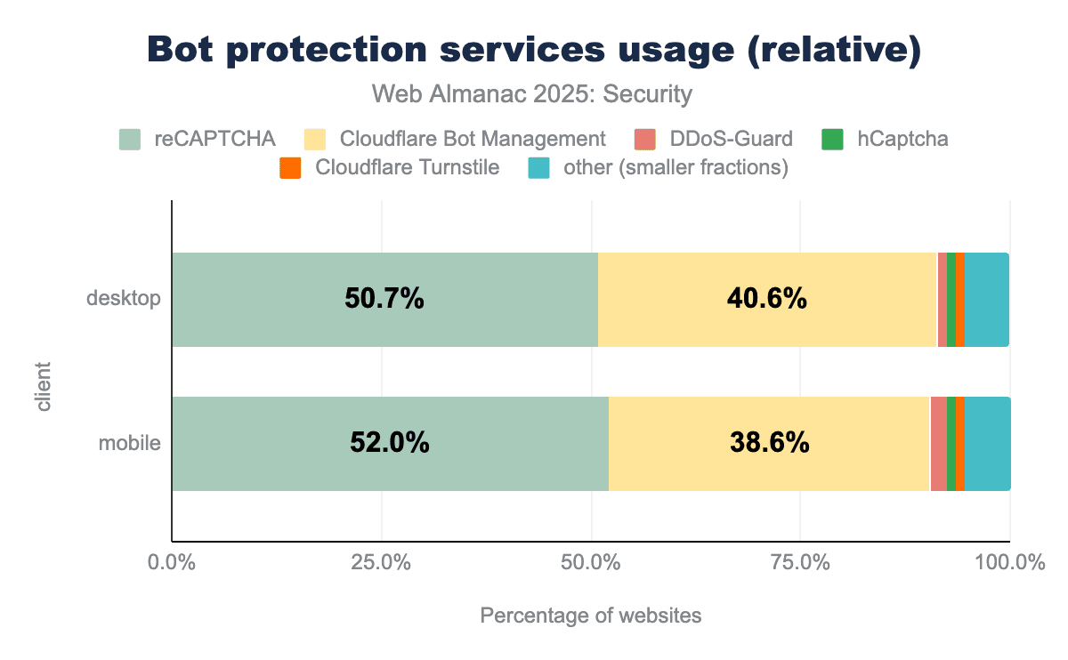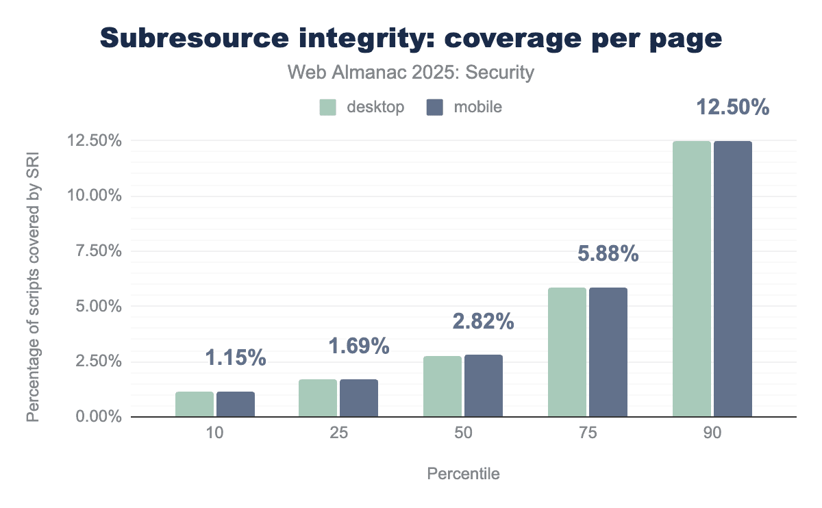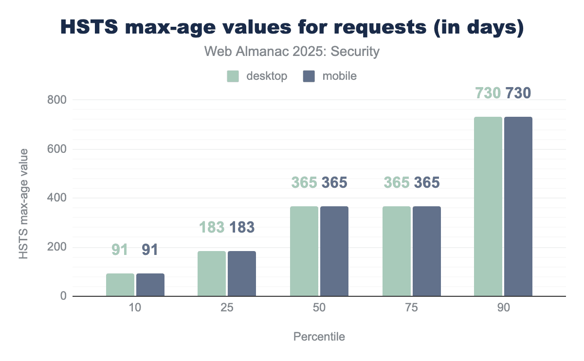 The share of requests that are being sent using HTTPS rather than using plain HTTP creeps ever closer to 100%, rising by another 0.74% on mobile compared to the 2024 edition of Web Almanac.