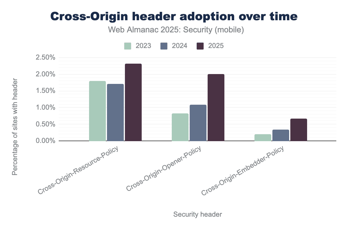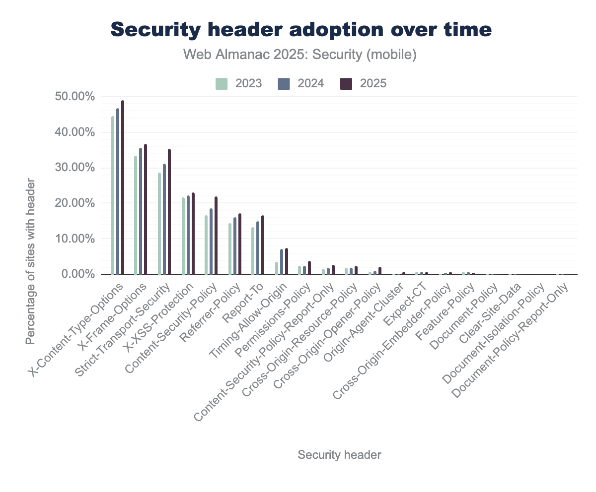 We find that around 0.11% of mobile sites attempt to set security headers that browsers explicitly do not support via <meta> tags. The most frequently attempted policies are X-Frame-Options, X-Content-Type-Options and Permissions-Policy. Compared to 2024, we see that the number of mobile sites setting these policies in <meta> rose in absolute numbers by more than 5,000 pages, showing that these misconfigurations are still actively being set by developers.